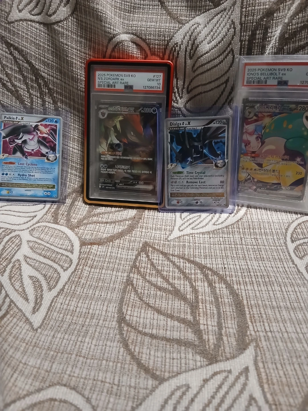 Collection of Pokemon trading cards featuring Palkia, Zoroark, Dialga, and Bellibolt. Includes cards from the 2025 Pokemon SV9 KO series. Some cards are graded.