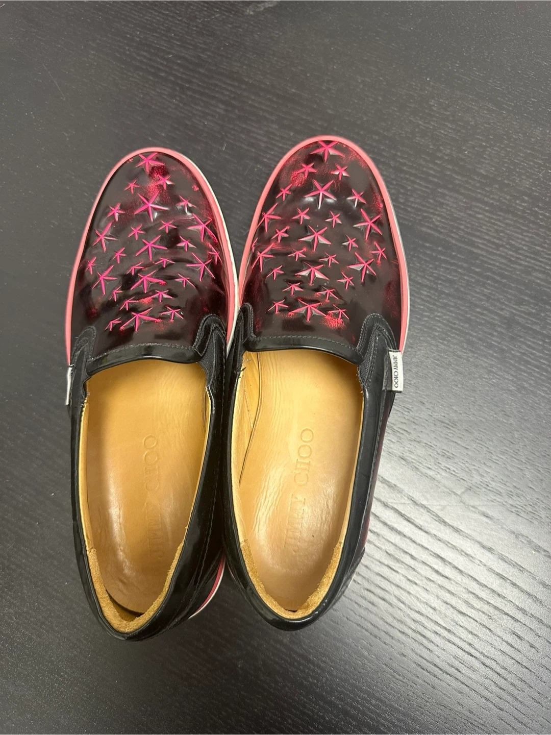 These Jimmy Choo slip-on sneakers are black with a patent finish and feature a vibrant pink star pattern. They have a contrasting pink sole and interior lining. Made in Italy. A stylish statement piece for any wardrobe!