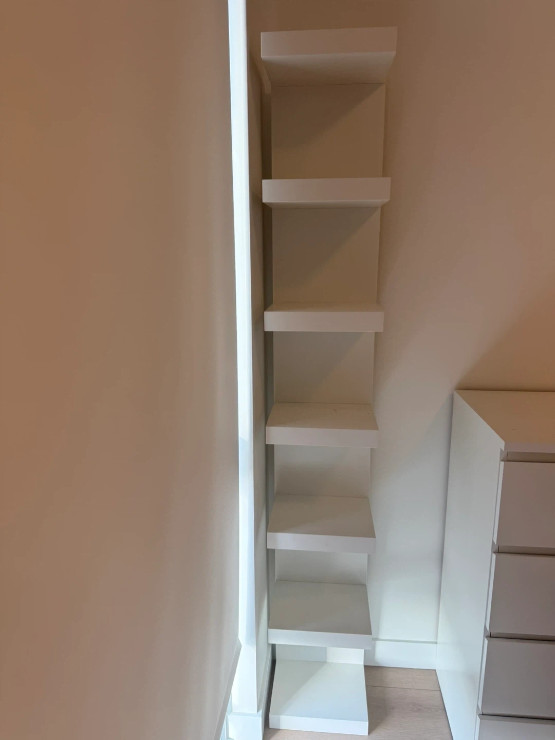 A tall, narrow white shelving unit with five shelves. It's great for organizing books or decorative items. This unit would be useful for small spaces needing extra storage.