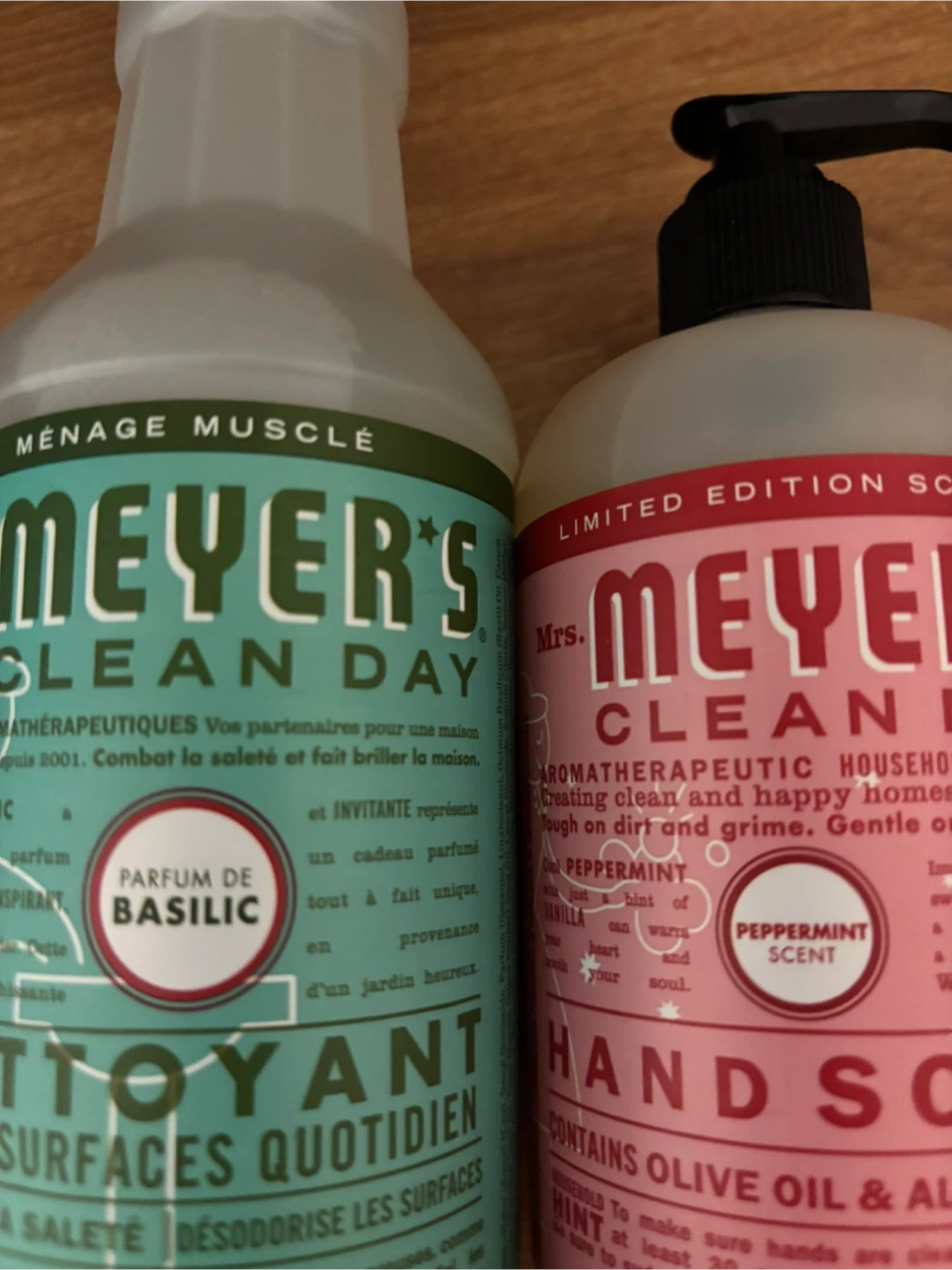 Includes Mrs. Meyer's Clean Day Multi-Surface Everyday Cleaner in Basil scent (473 mL) and Mrs. Meyer's Clean Day Hand Soap in Peppermint scent (370 mL). Both bottles have pump dispensers. This set is great for keeping your home clean and smelling fresh!