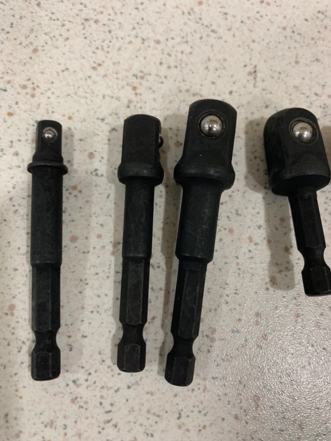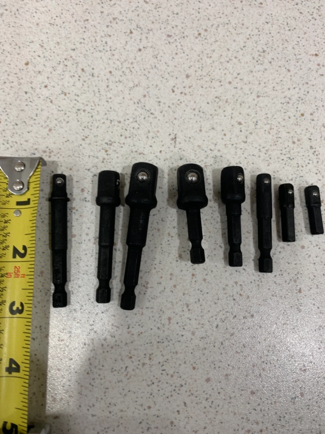 This is a set of 8 black socket adapter extensions. They appear to be made of metal and come in various sizes. These adapters are useful for reaching fasteners in tight spaces.