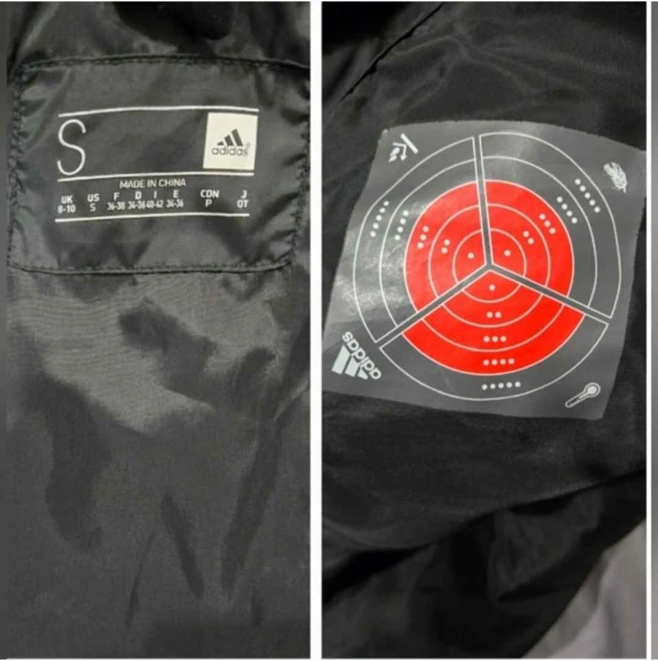 Special Tech: Features an internal "Warmth" graphic indicator (red target icon) common in specific Adidas outdoor performance lines.