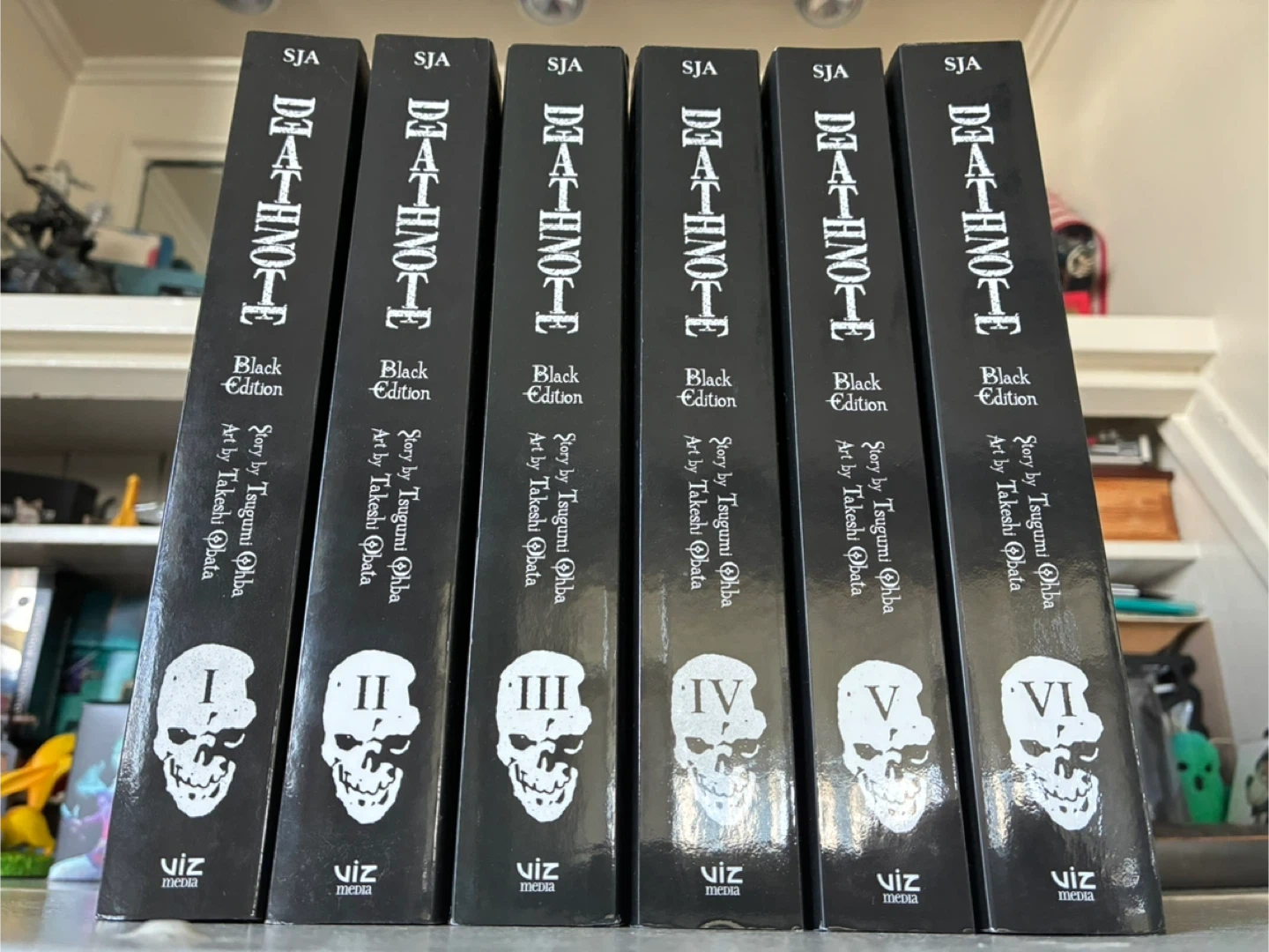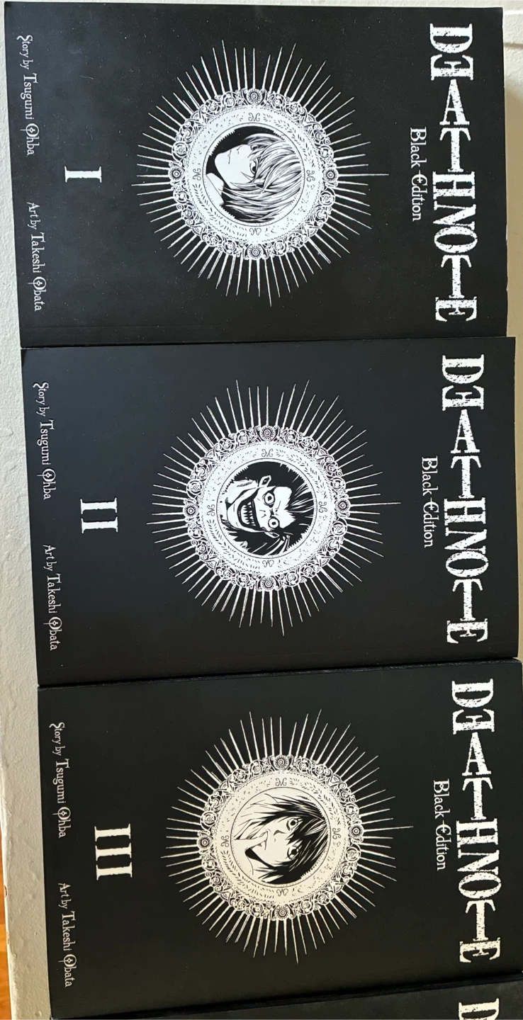 Complete set (volume 1-6) of the Death Note Manga in rare Black Edition (covers and page edges are a velvety soft black matte texture). Some fading and a little damage on two of the backs as pictured. Pages are all in perfect condition.
