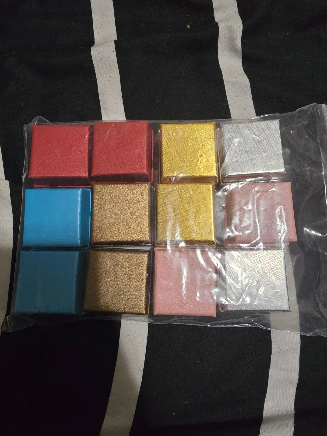 Set of 12 small gift boxes. Each box comes with a decorative ribbon. Available in assorted colours, perfect for small gifts or favours.