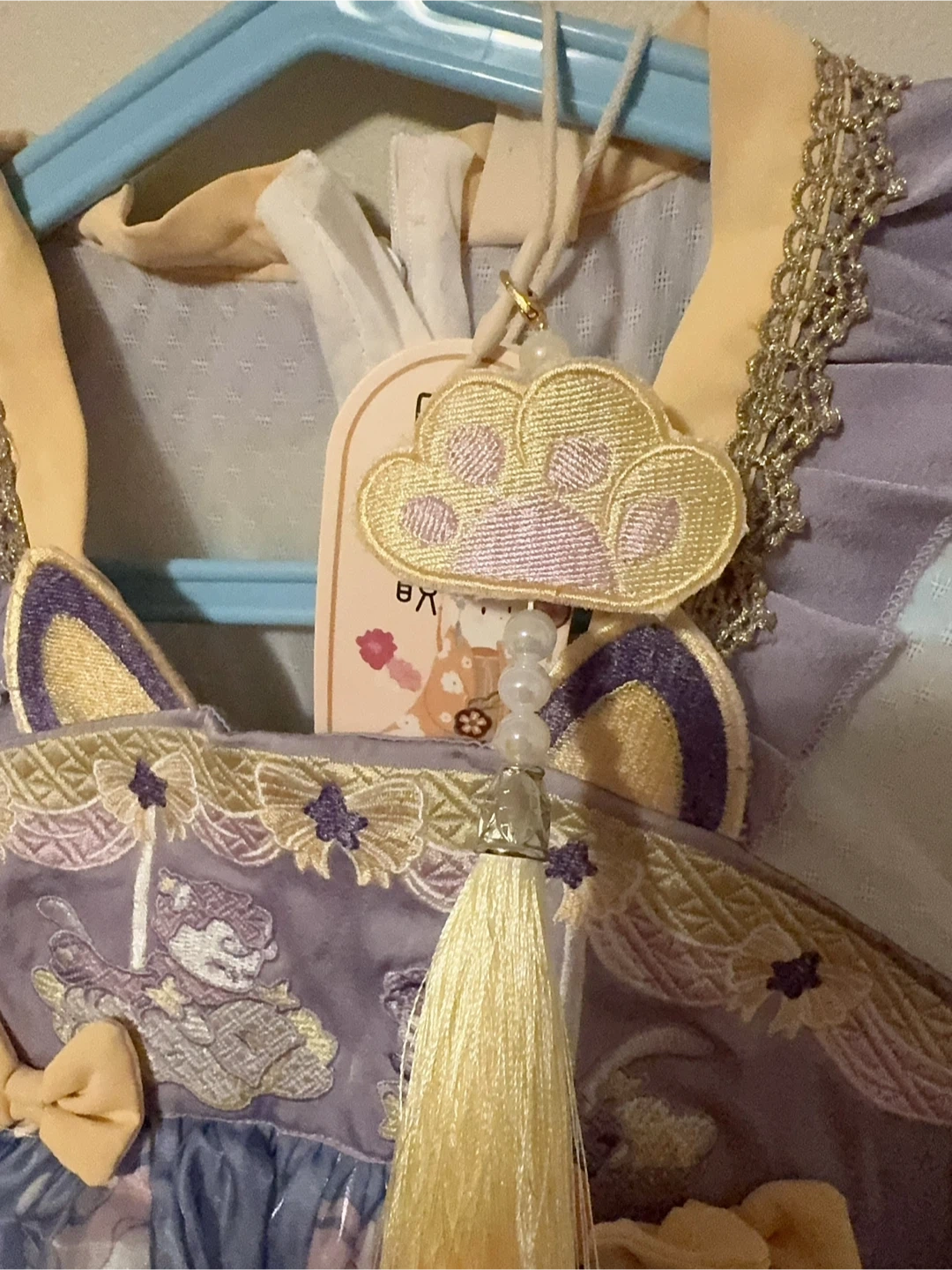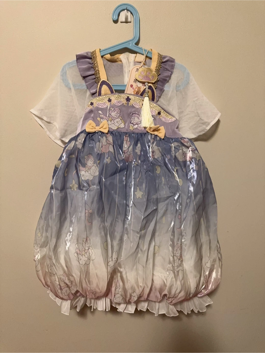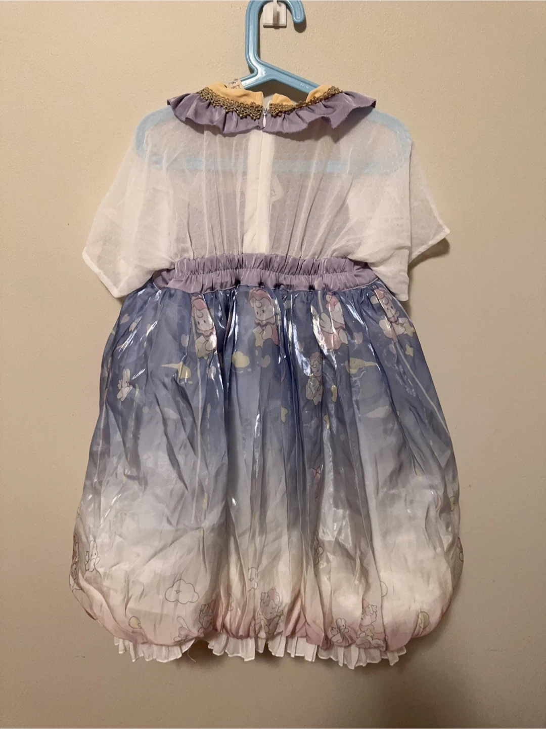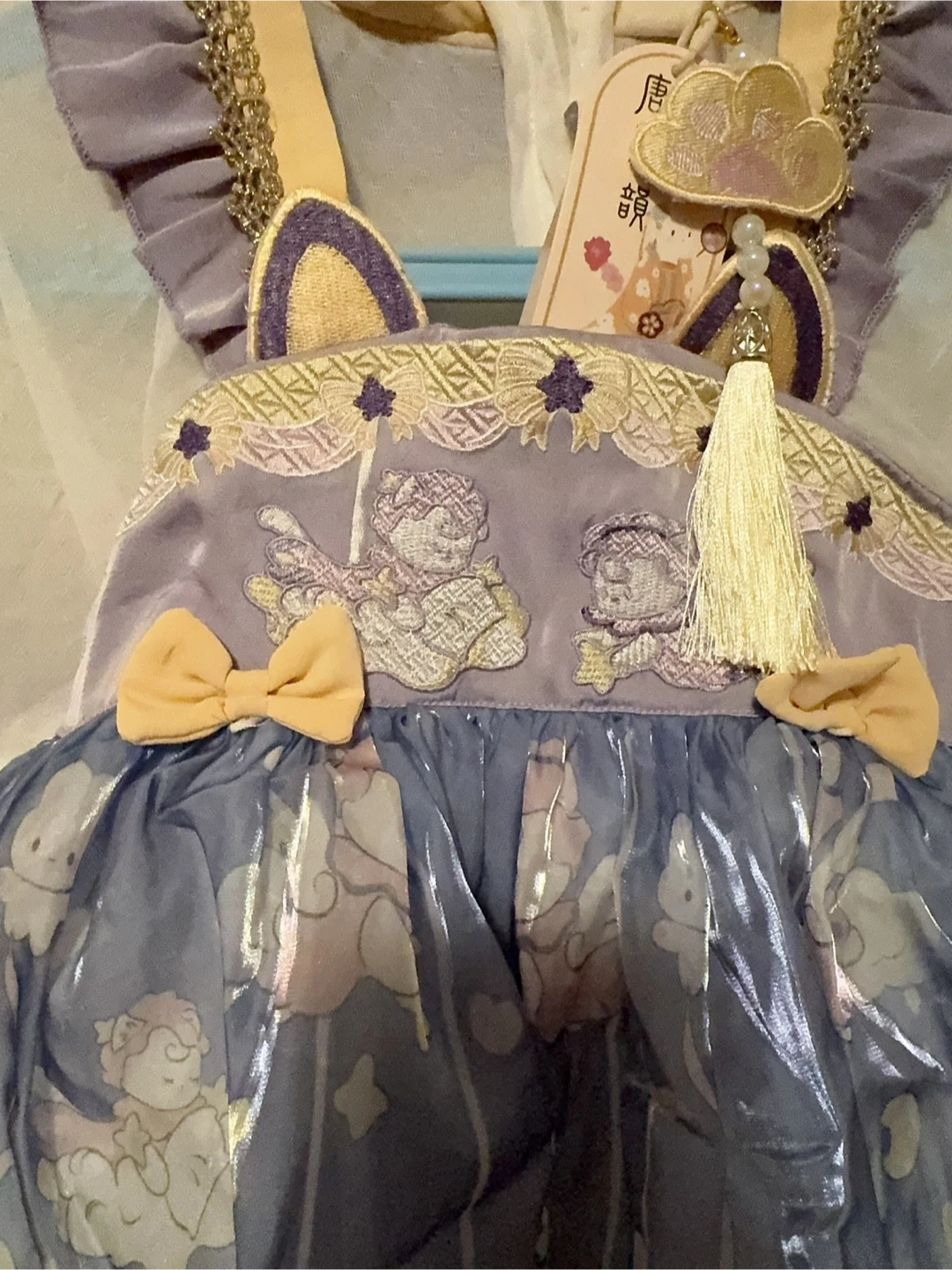 This cute dress features a purple velvet bodice with embroidered details and cat ears. It has a sheer white overlay with a ruffled collar. The skirt is blue with a shimmering cloud and bunny print, and a ruffled hem. It includes a decorative tassel charm.