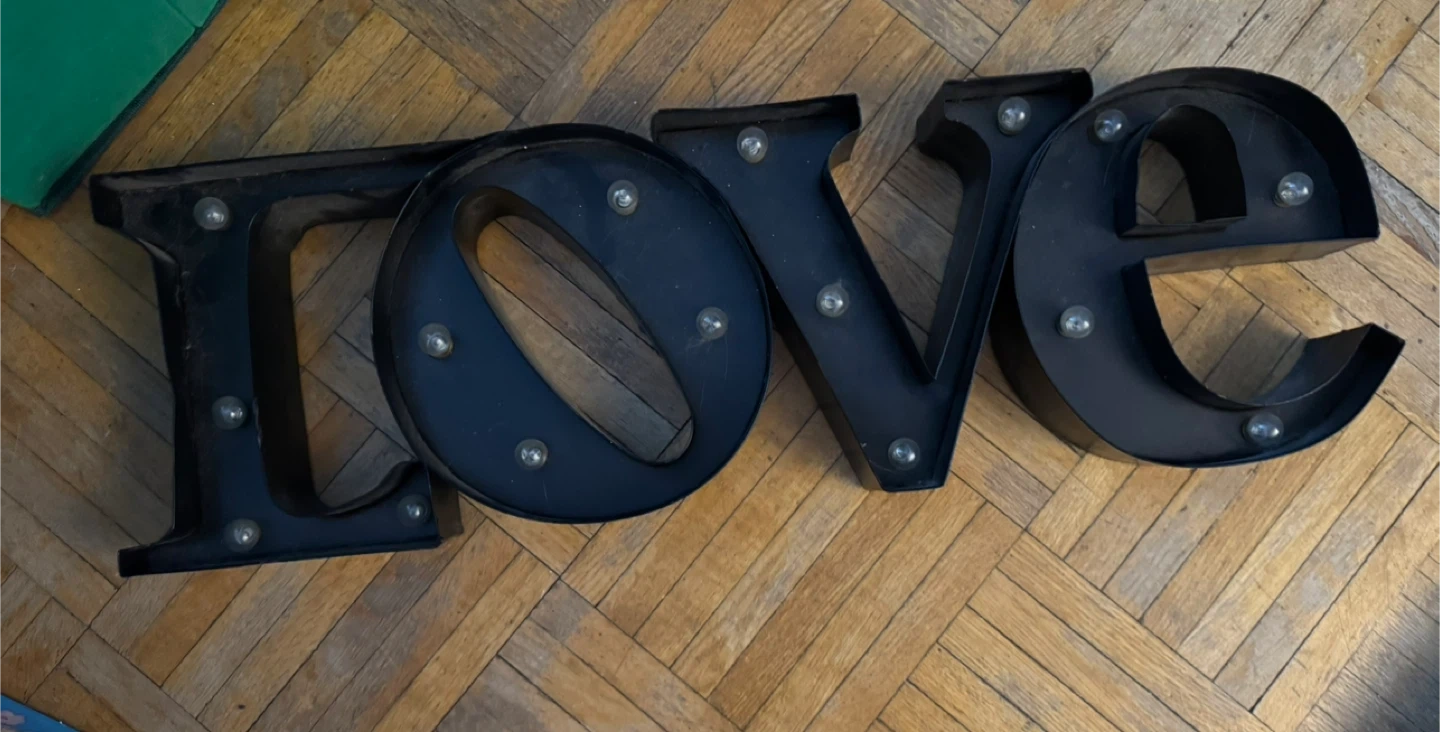 This is a black marquee sign that spells out LOVE. It has individual light bulbs for illumination. The letters are made of metal with a matte black finish.