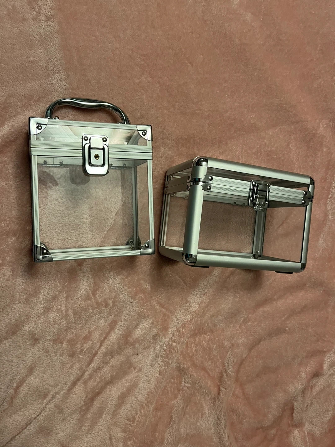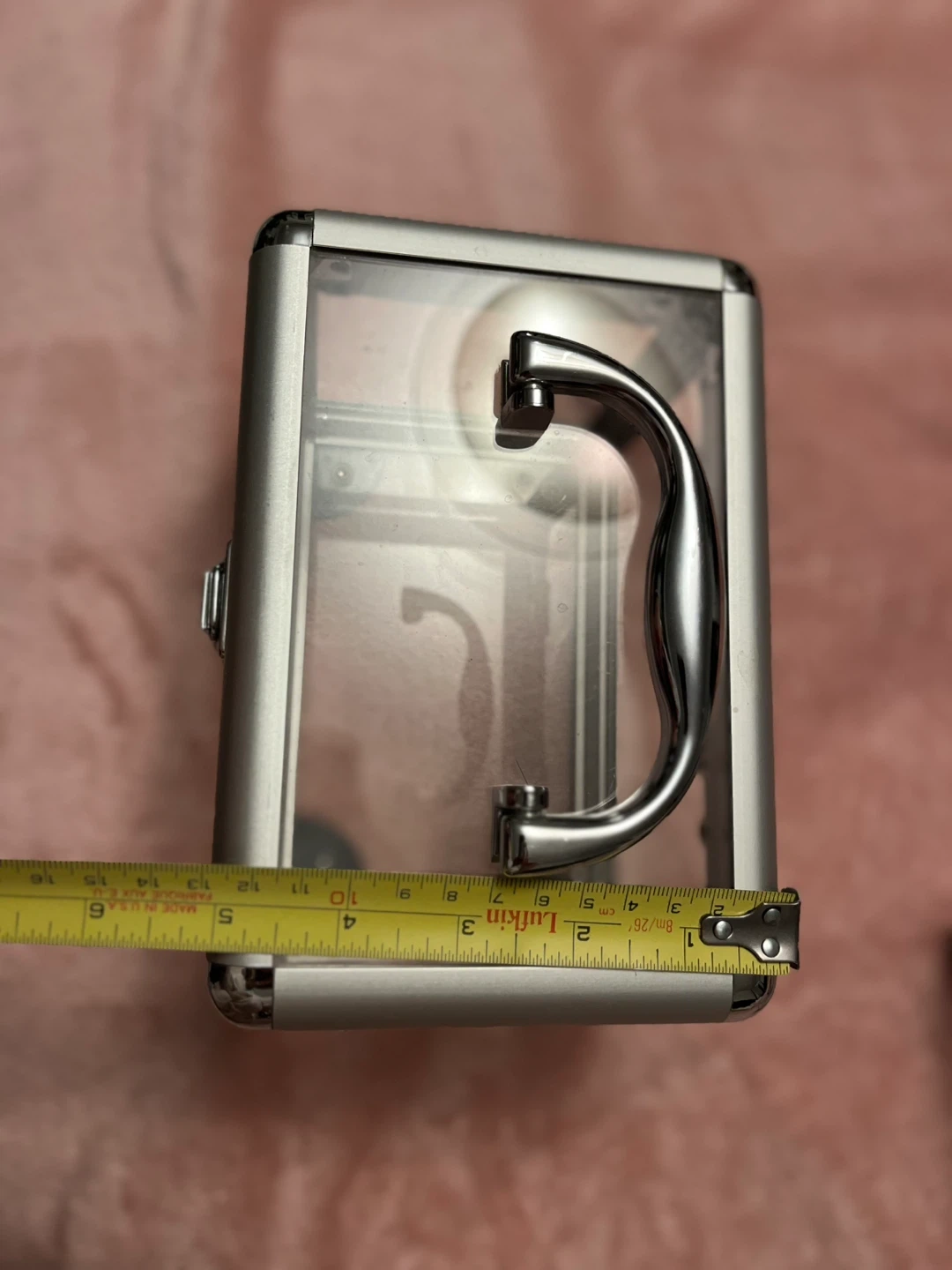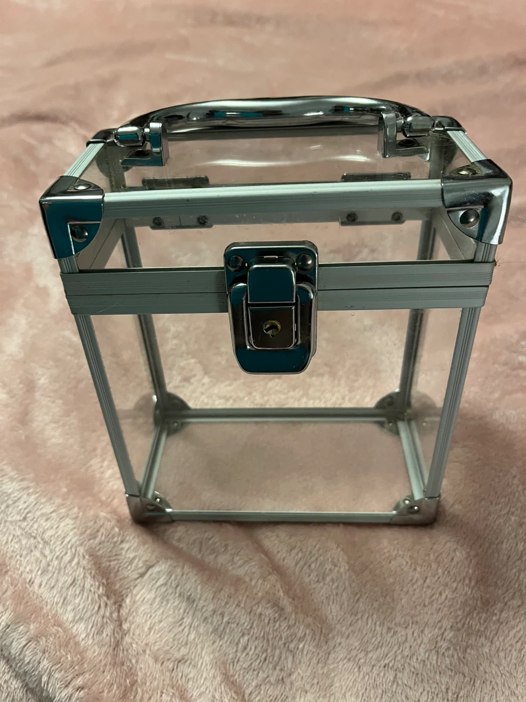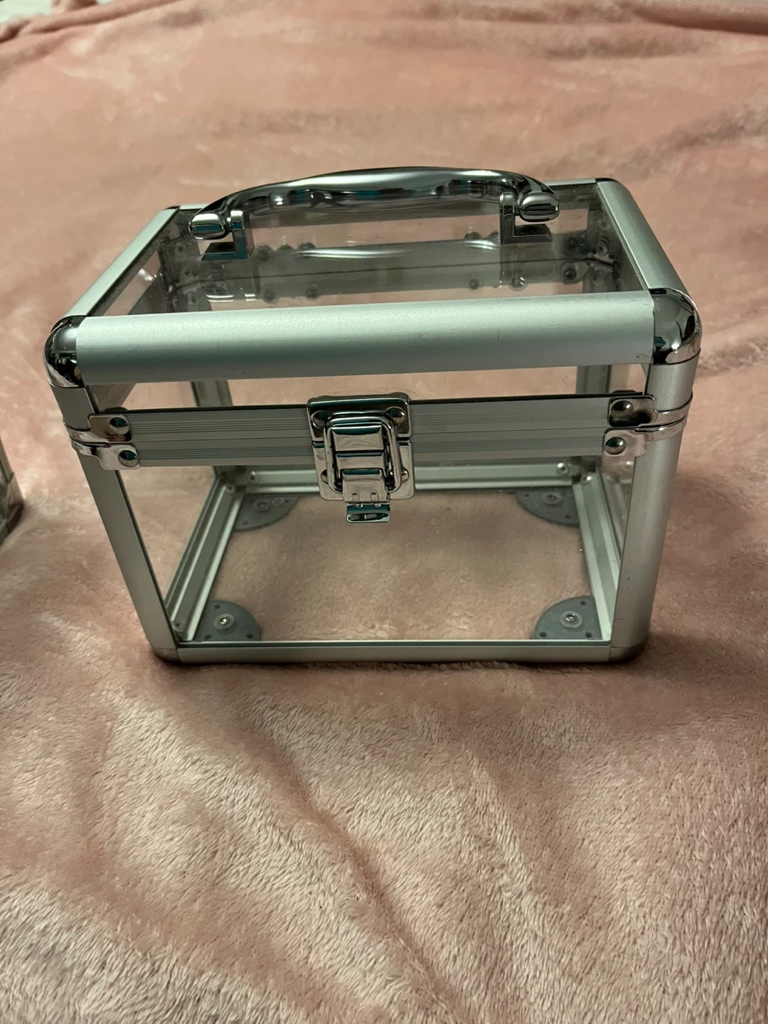 This clear case with silver metal trim and a latch closure. It's made of transparent acrylic and metal. Dimensions are roughly 6 inches high and 6 inches wide. It's handy for storing makeup or small accessories!