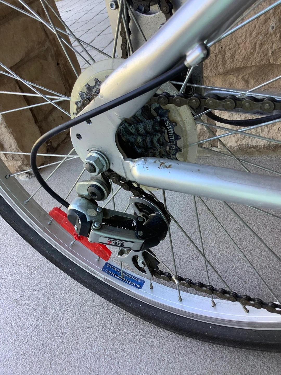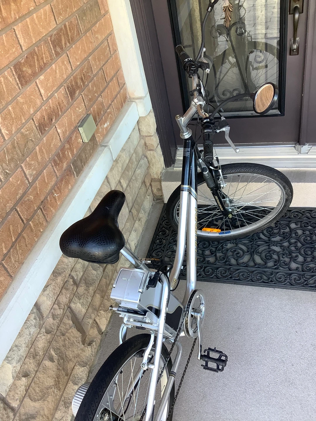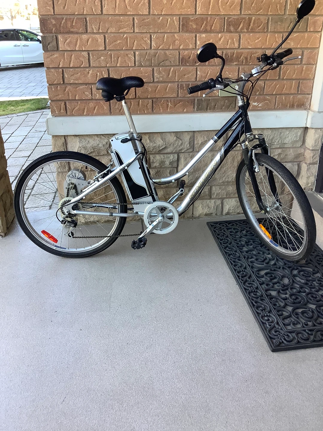 This is a Schwinn electric bicycle. It's silver and black with a comfortable seat. The pedals have a good grip.