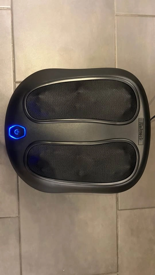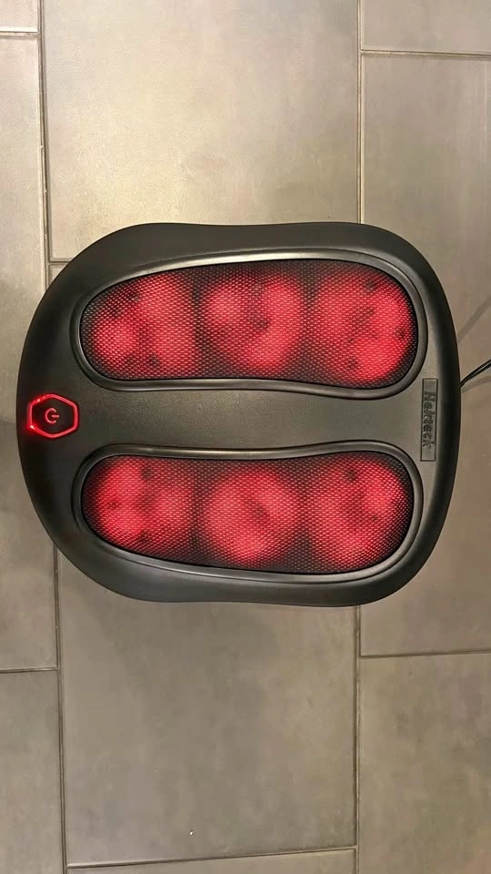 Great Nekteck shiatsu foot massager. Has heat function and deep kneading nodes. Power button with blue light. Model NK-FM-100-BLK.