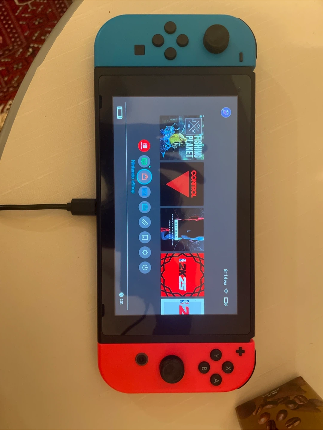 This is a Nintendo Switch console with blue and red Joy-Cons. It's great for gaming on the go or at home. The console has a built-in screen and detachable controllers for versatile play.