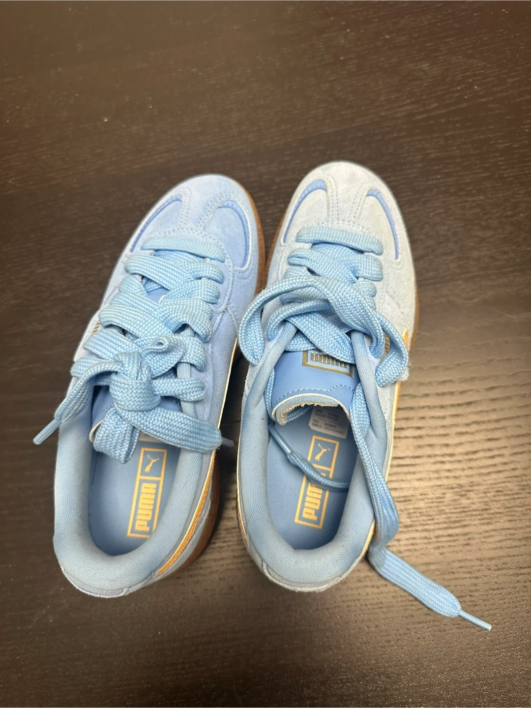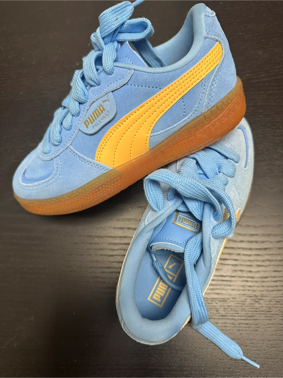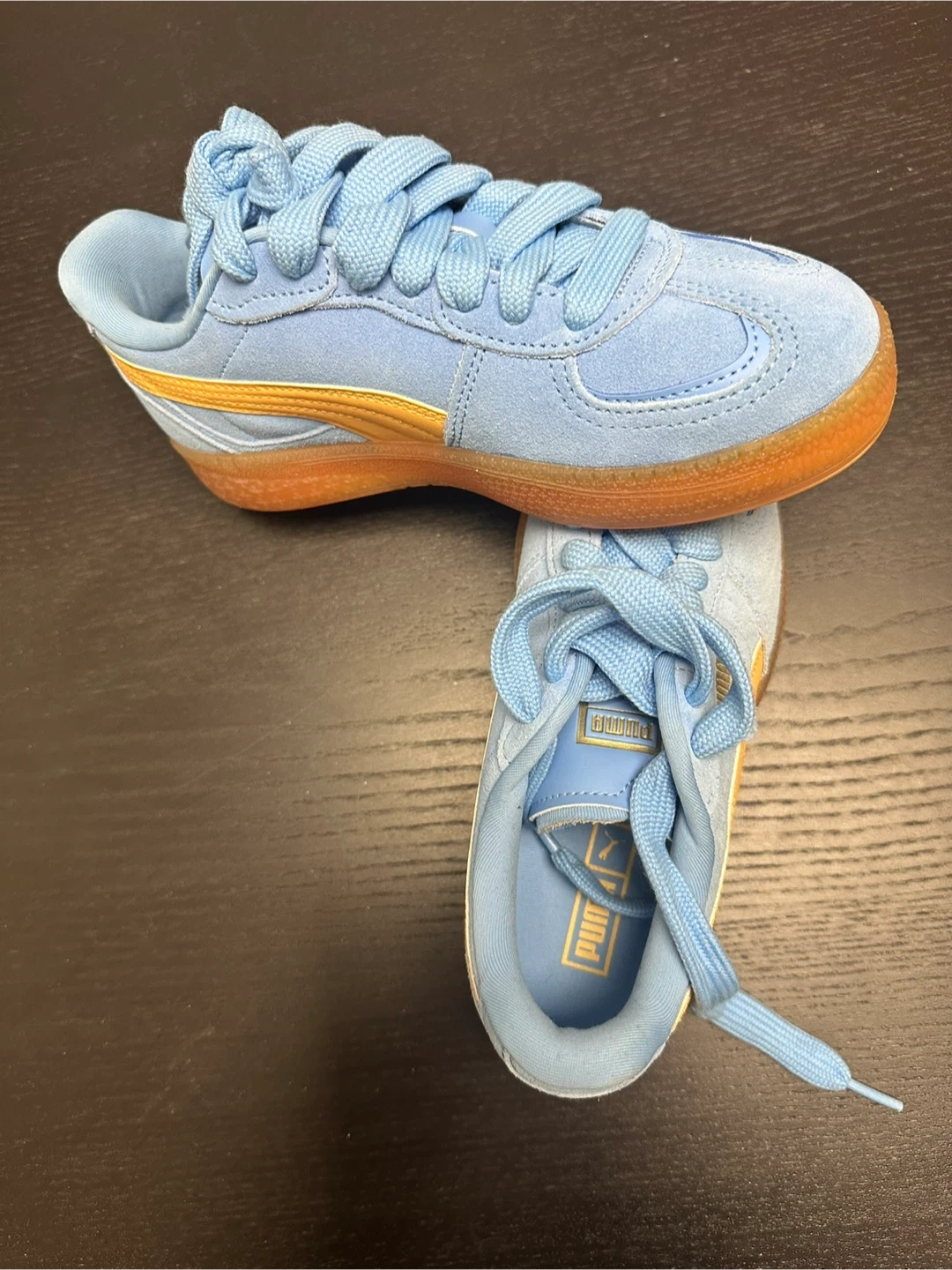 Kids' Puma Palermo sneakers in a light blue and gold colourway. These shoes feature a suede upper with classic Puma branding. Durable gum sole for traction. Great for everyday wear!