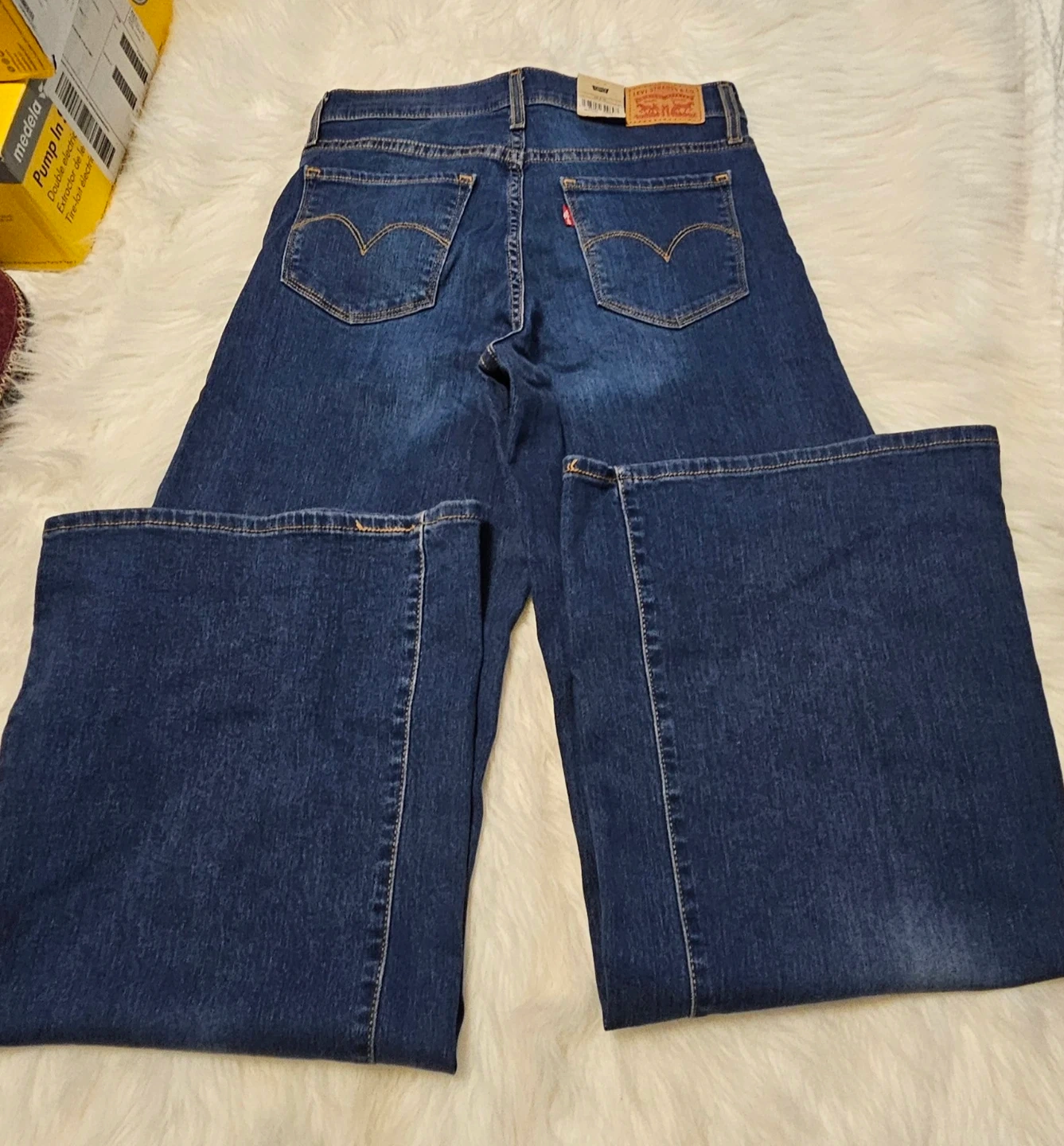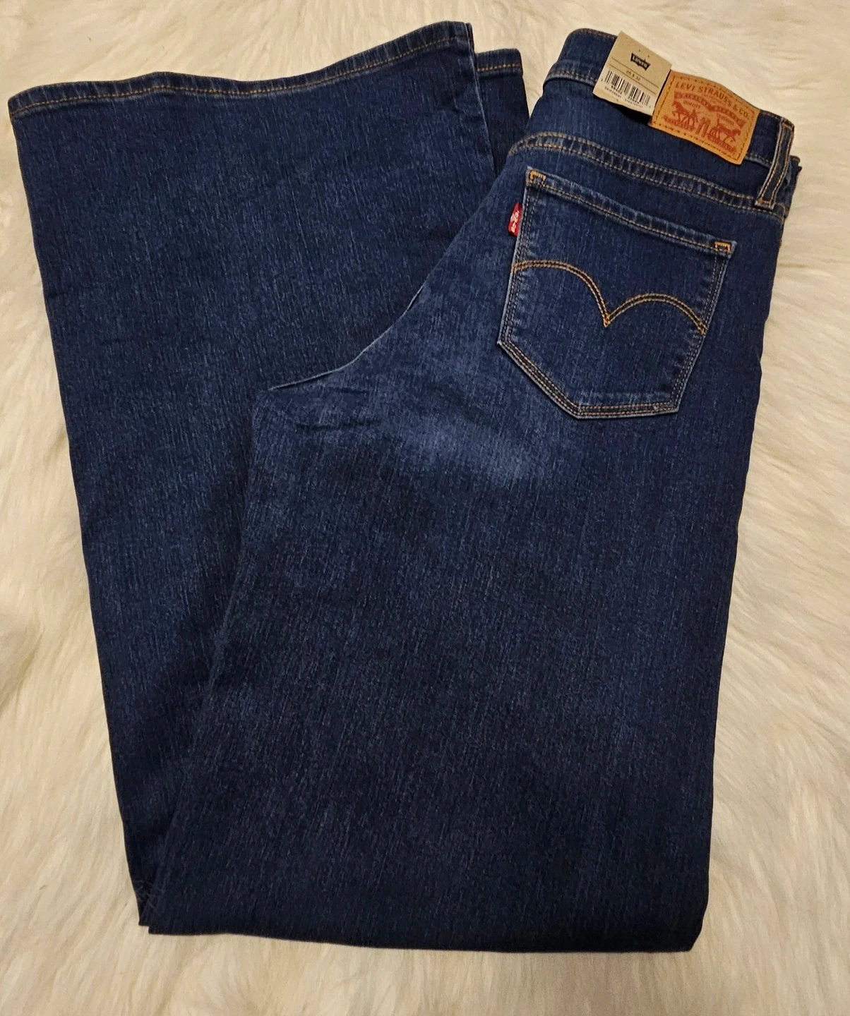 These are Levi's women's jeans with a high-waisted, wide-leg fit. They're made of denim. The size is 28x32. These jeans would be useful for a casual outing or to dress up for a night out. A Mid Rise, Smoothing Tummy Panel, Loose Through the Hip and Thigh, Wide Leg. Brand New!