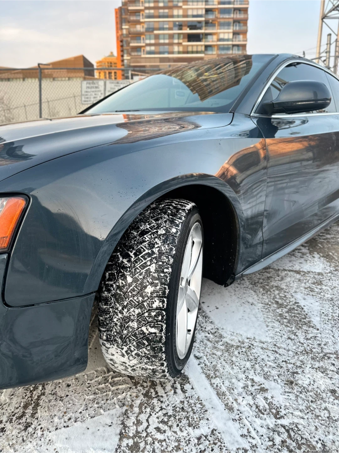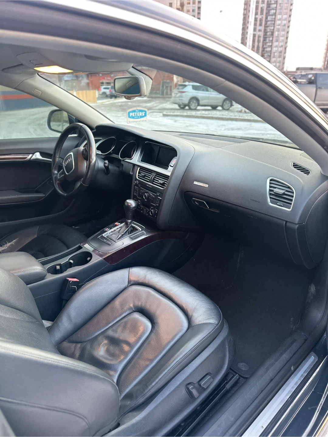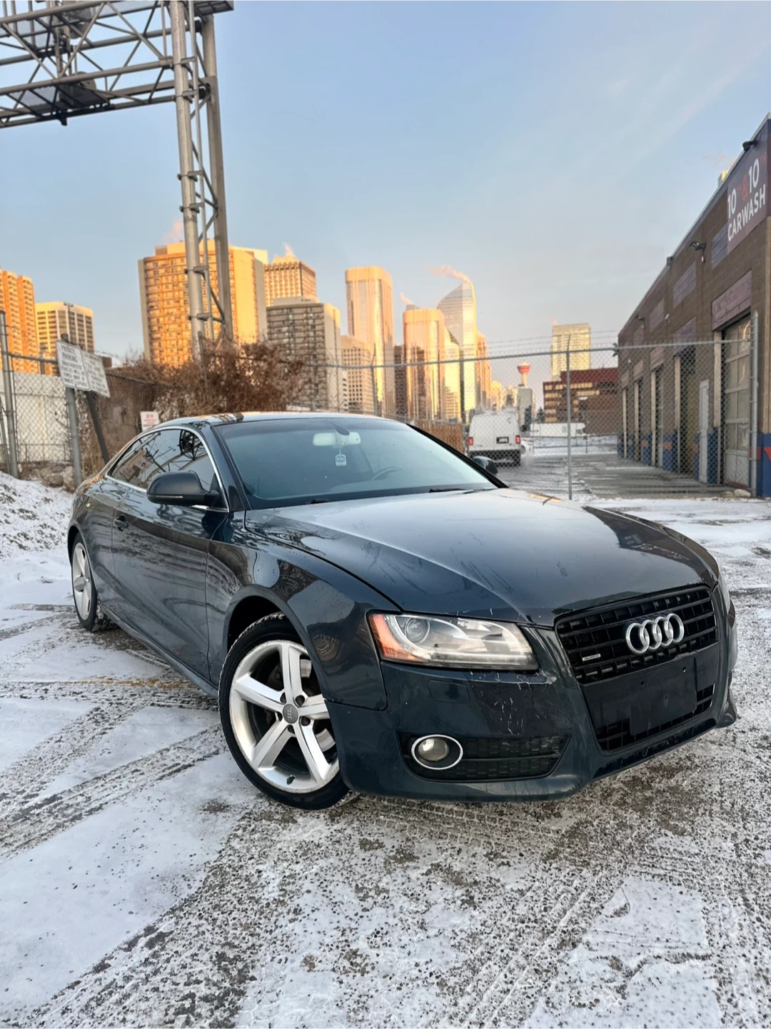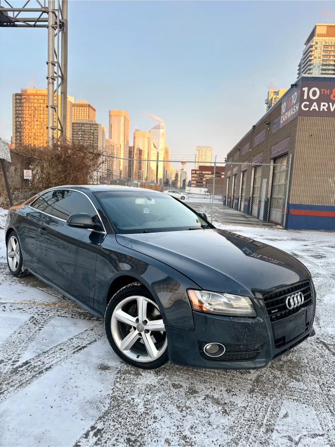 This is a dark grey Audi A5 coupe. It has black leather interior and alloy wheels. This car is great for city driving and highway cruising.