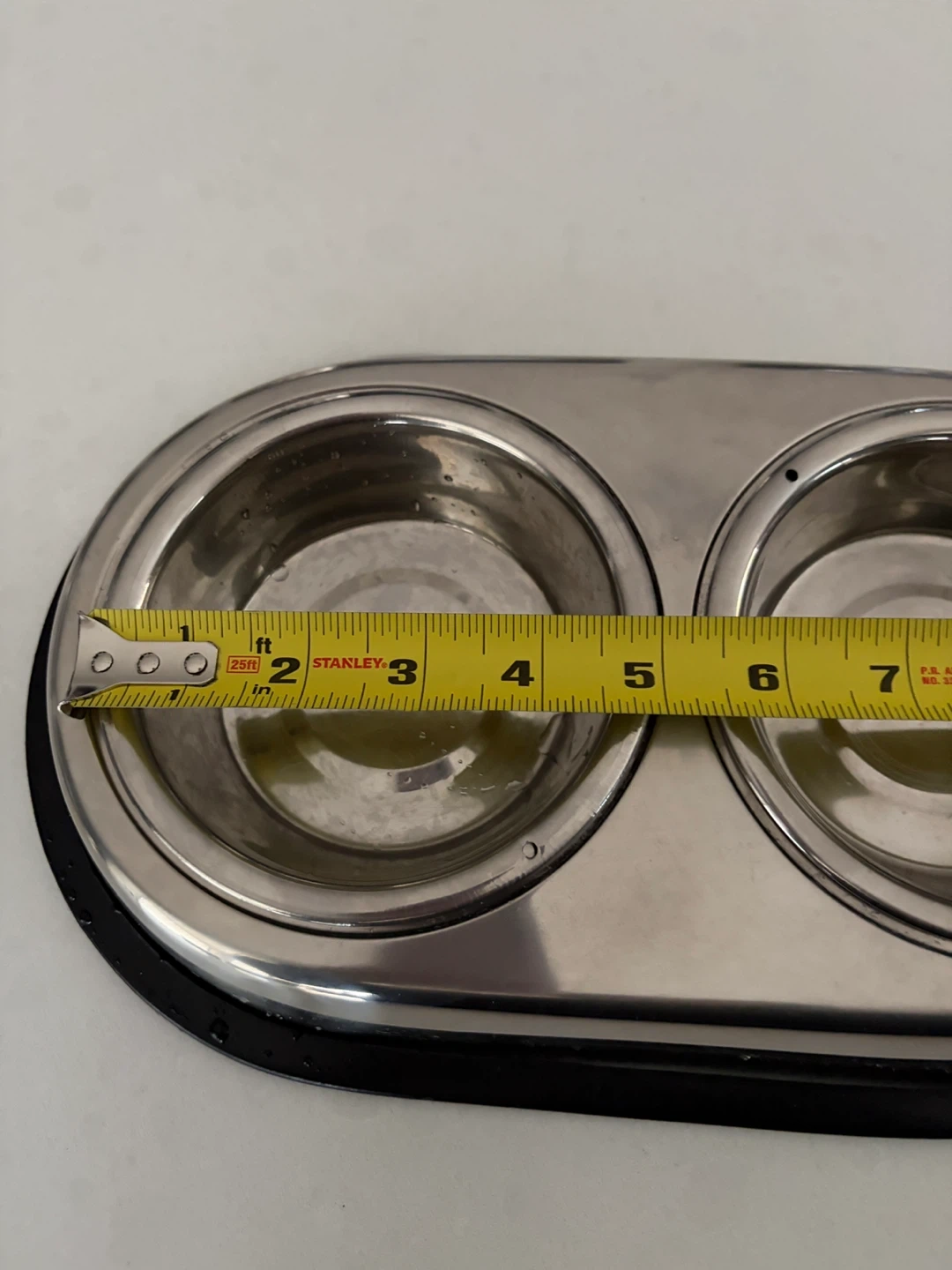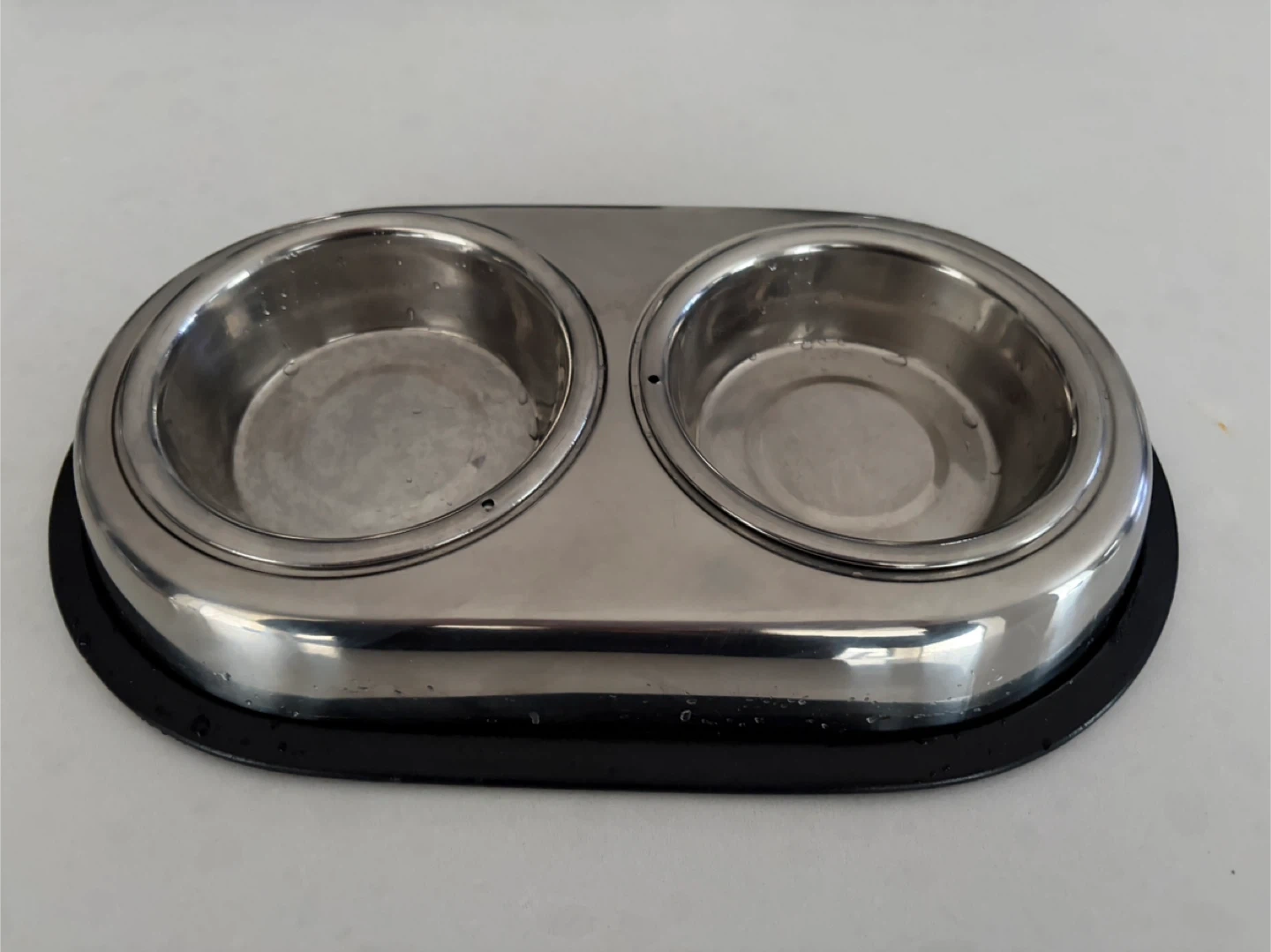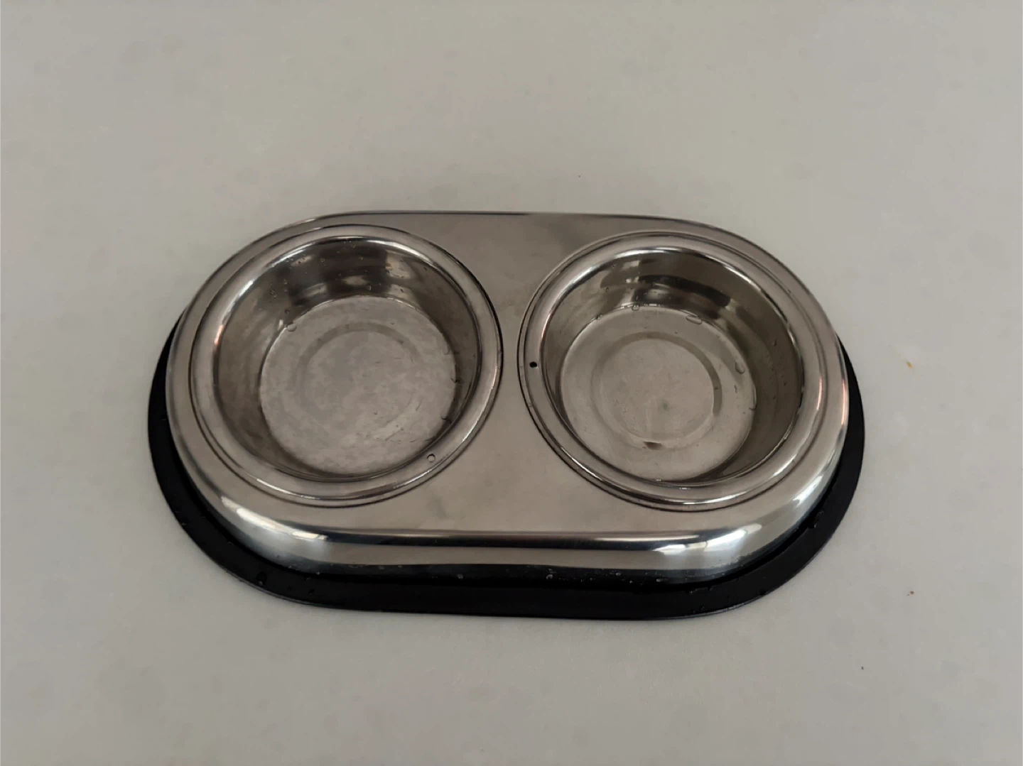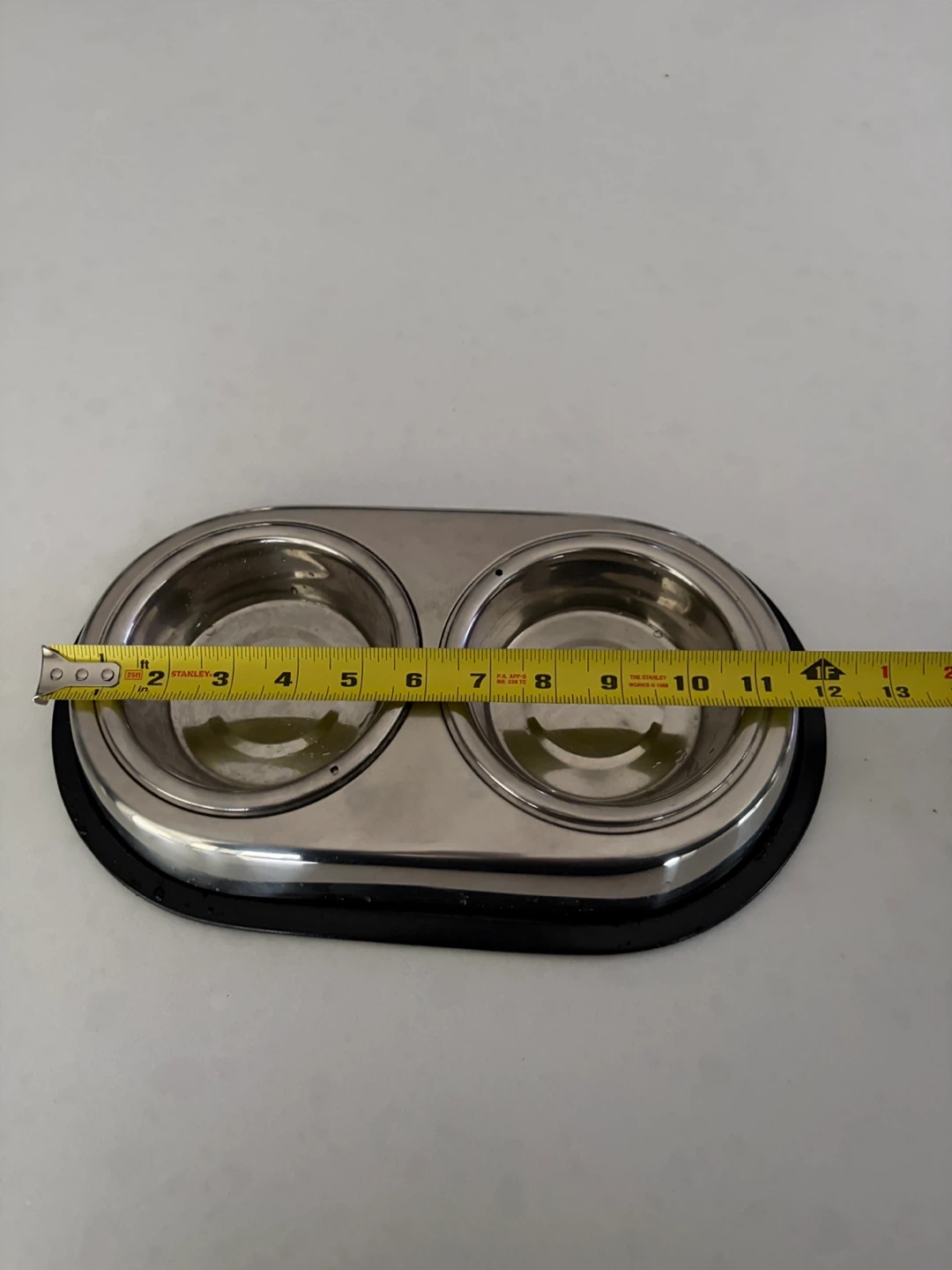 This is a double pet bowl set for food and water. It's made of stainless steel and sits on a non-slip rubber base. The set measures about 13 inches long and each bowl is approximately 3 inches in diameter. It's suitable for cats or small to medium dogs.