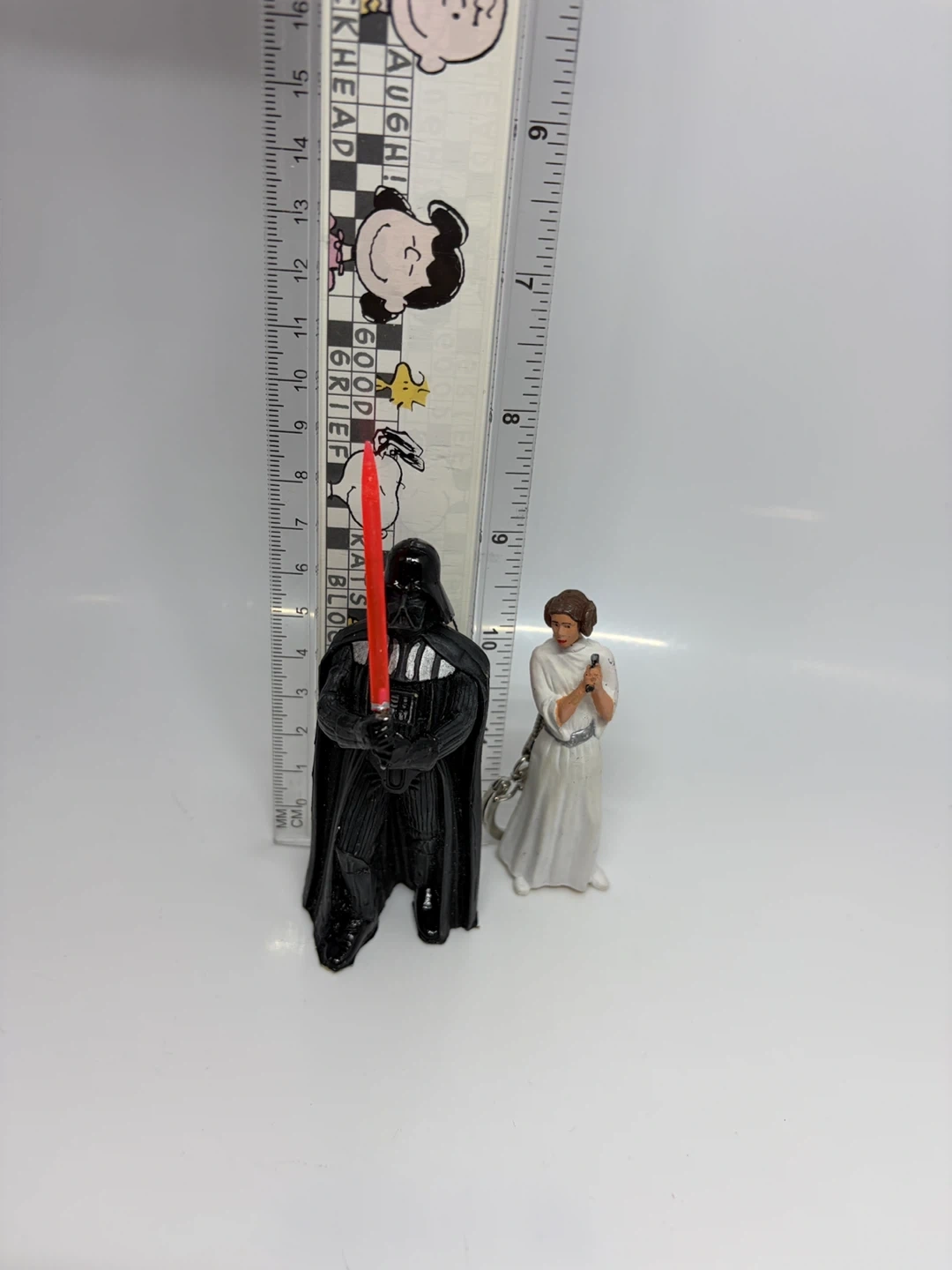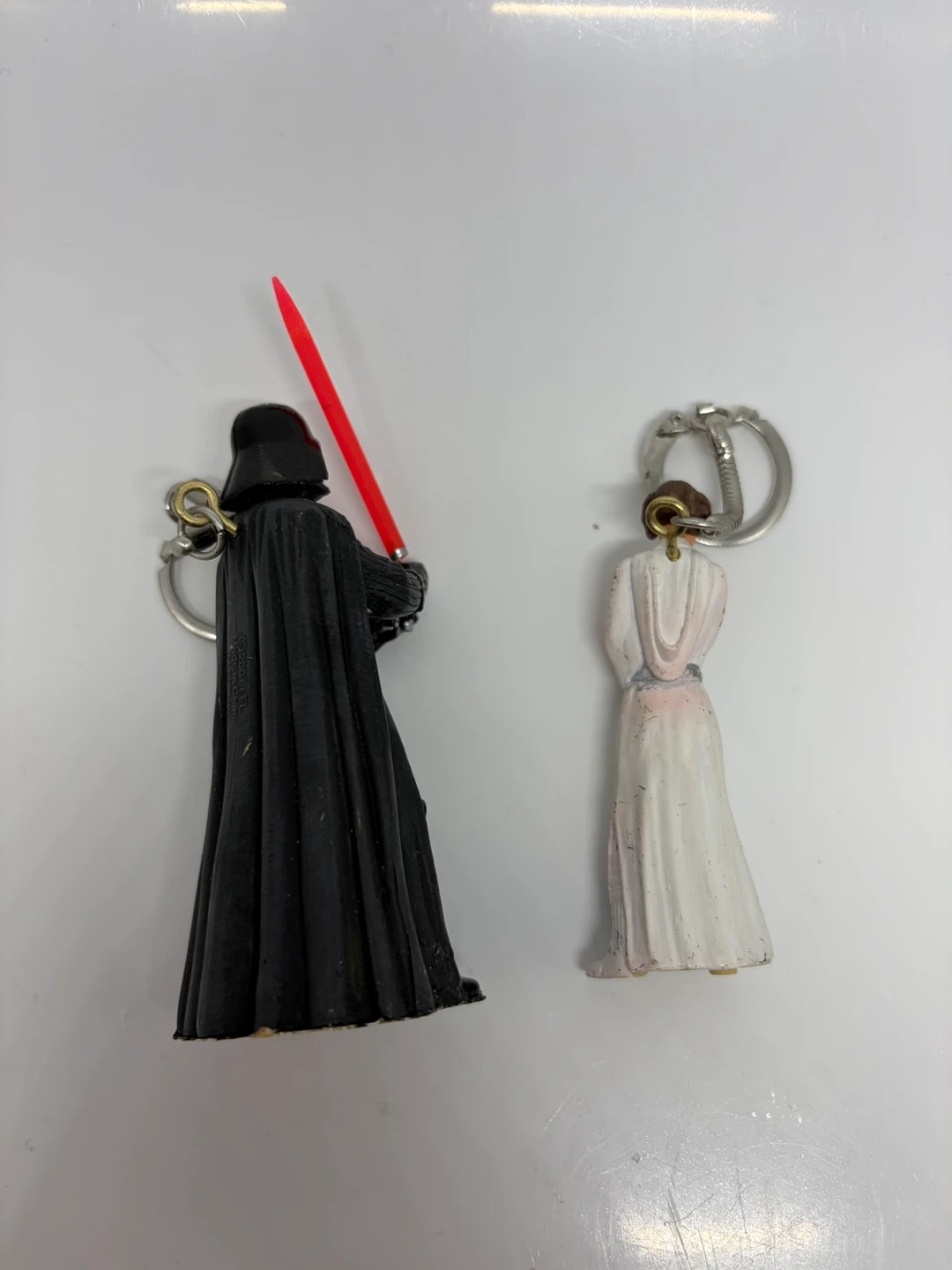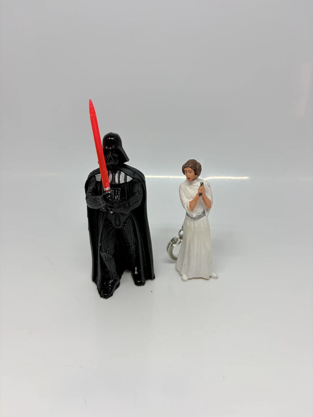 Set of two Star Wars figurines keychains featuring Darth Vader with his lightsaber and Princess Leia. Darth Vader is approximately 4 inches tall. Princess Leia is about 3 inches tall. Great for any Star Wars fan!