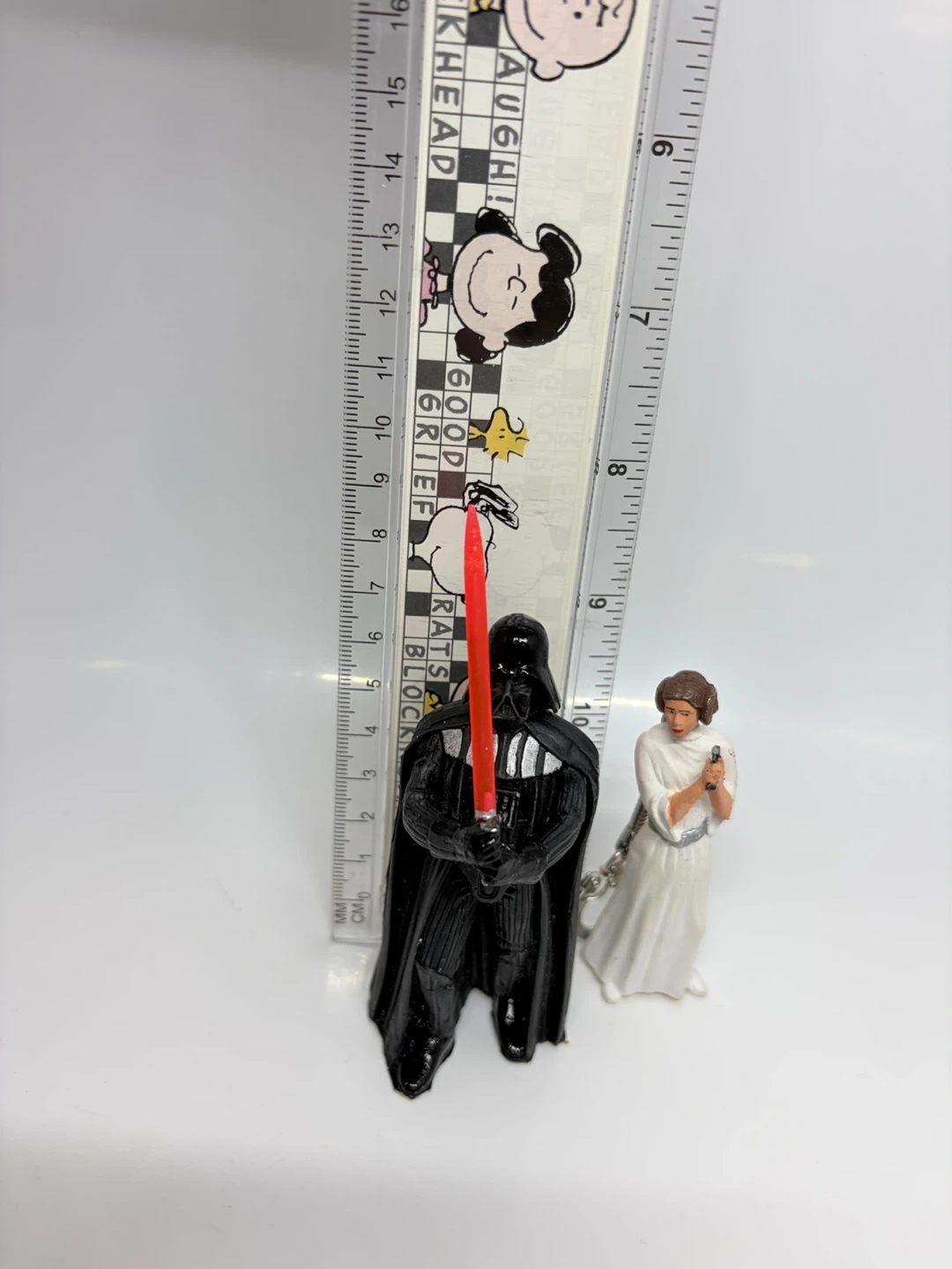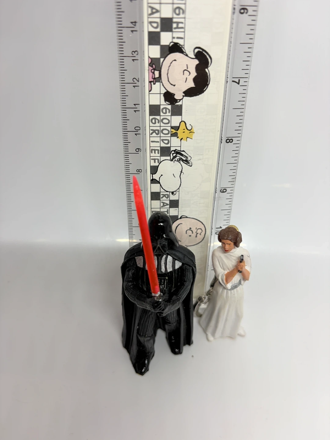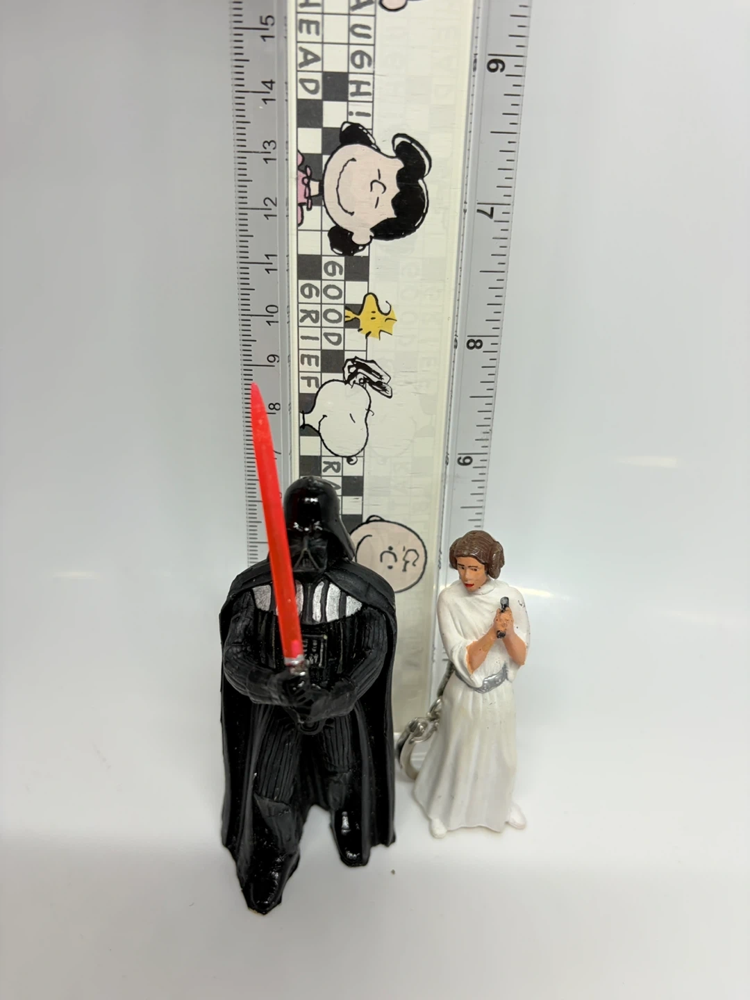 Set of two Star Wars figurines keychains featuring Darth Vader with his lightsaber and Princess Leia. Darth Vader is approximately 4 inches tall. Princess Leia is about 3 inches tall. Great for any Star Wars fan!