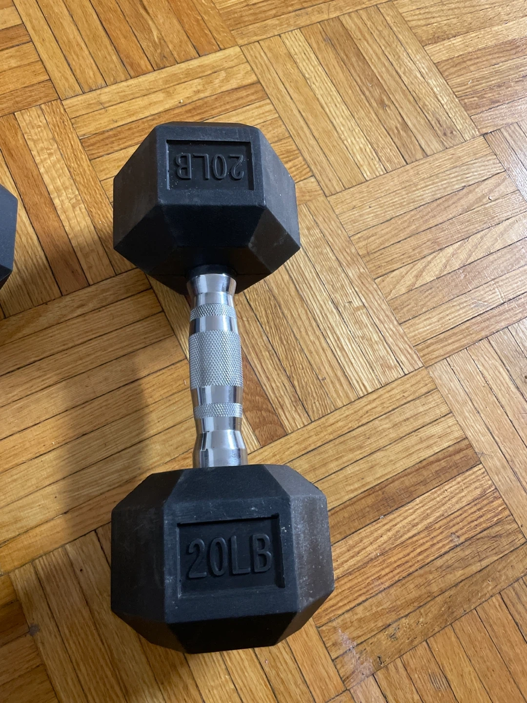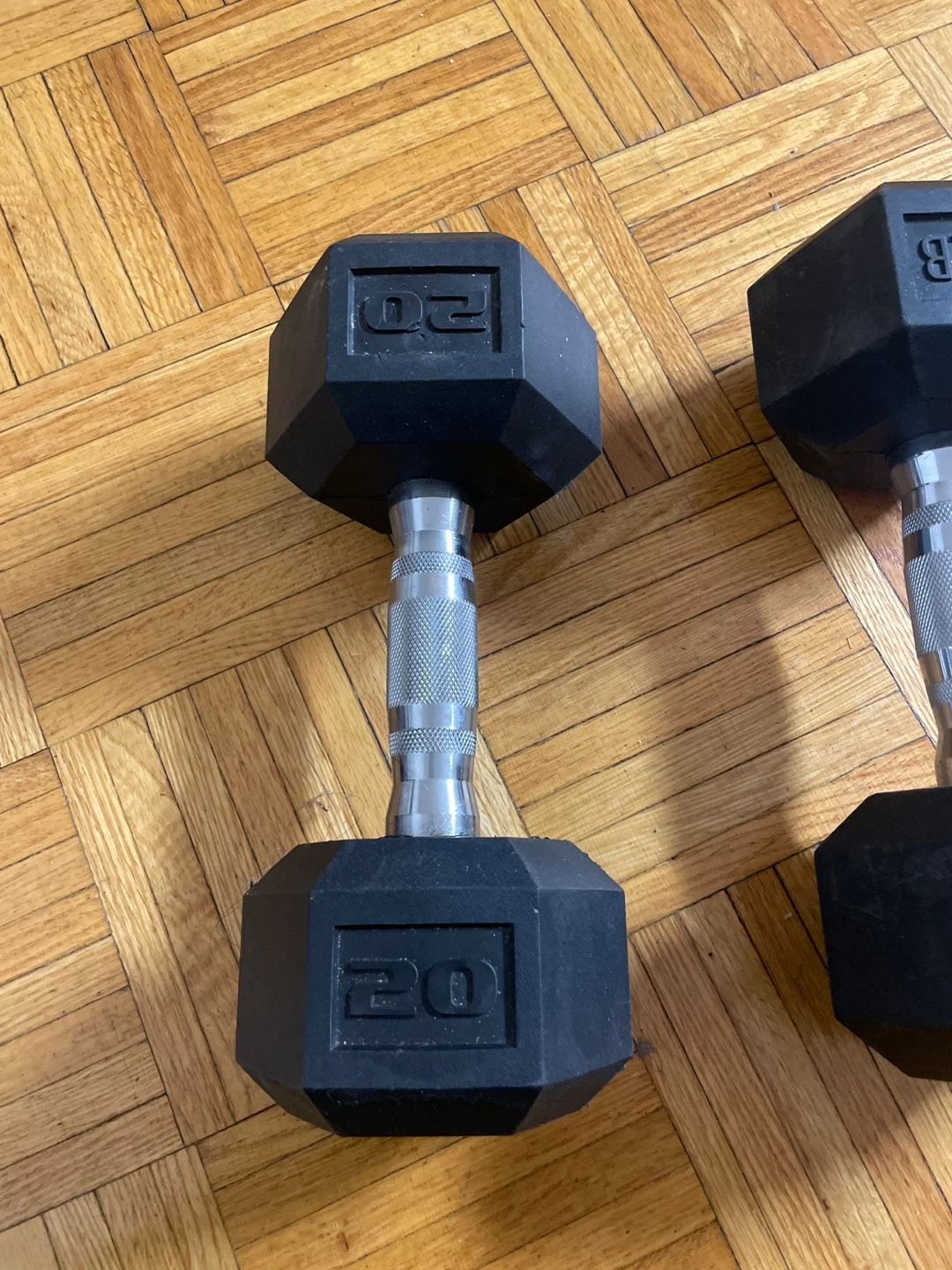 Four pairs of dumbbells for your home gym. Includes two 30lb hex dumbbells, two 20lb hex dumbbells, and some small dumbells These are great for a variety of strength training exercises.