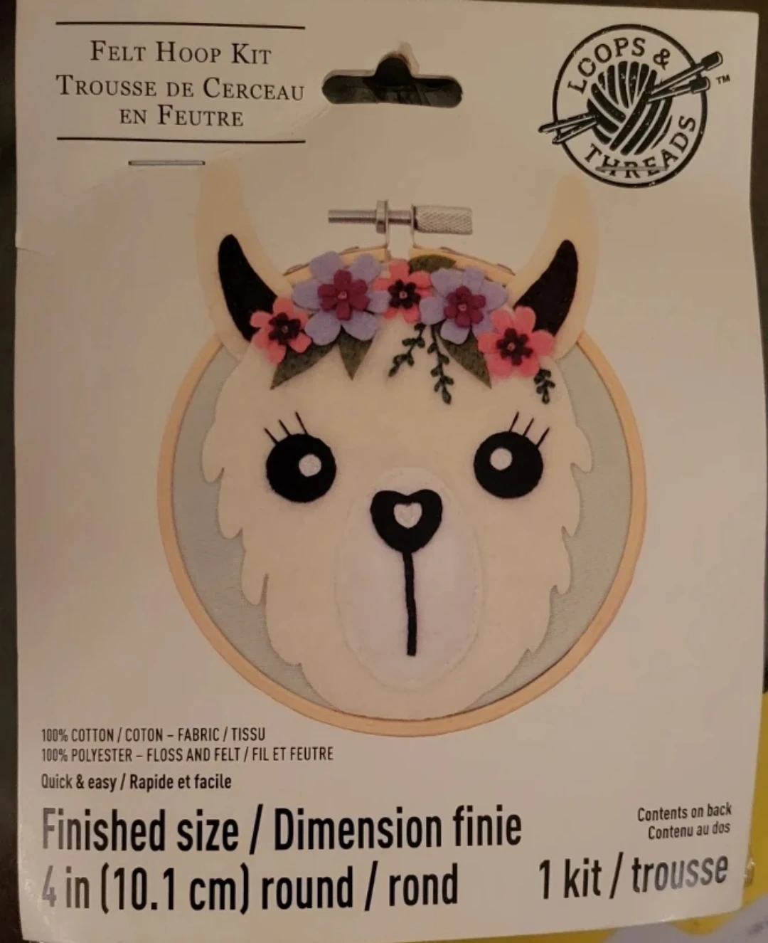 This is a new Loops & Threads felt hoop kit for creating a llama design. It includes 1 fabric panel, 5 floss colours, 10 felt colours, a bamboo embroidery hoop, and a needle. The finished size is 4 inches (10.1 cm) round. This kit is great for craft enthusiasts looking for a fun project!