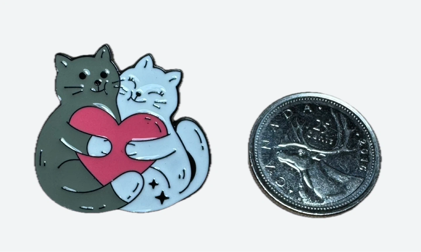 Adorable enamel pin featuring two cats hugging a pink heart. 🩷
