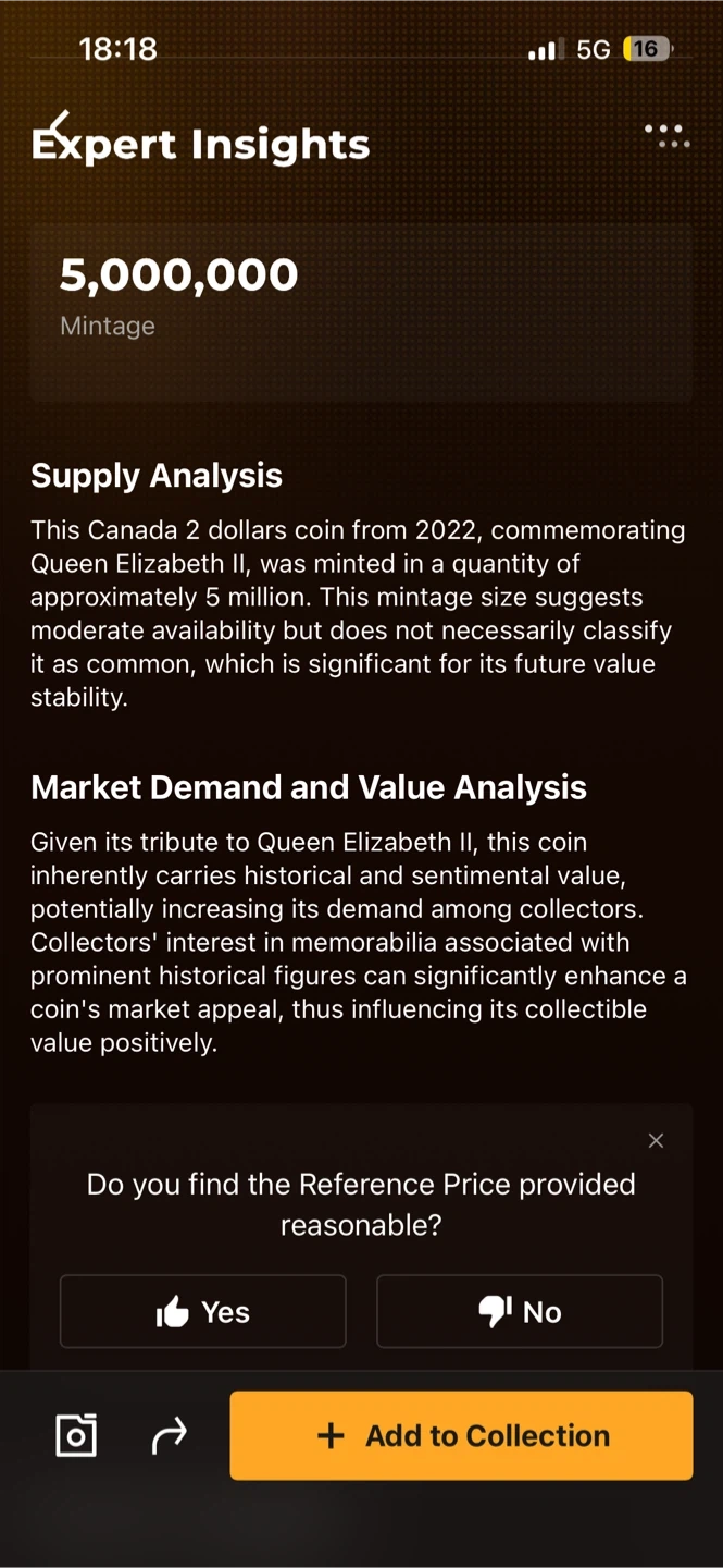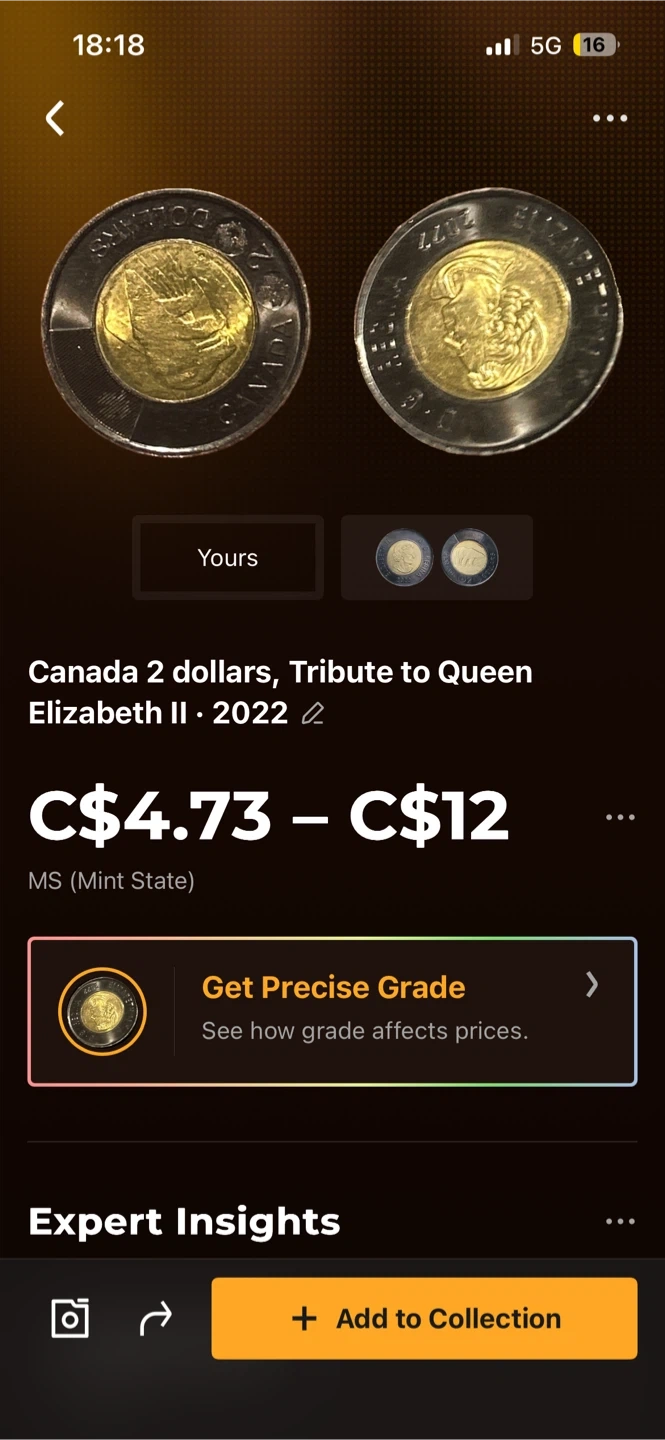 This is a 2022 Canadian 2 dollar coin featuring a tribute to Queen Elizabeth II. It's in mint state condition. The coin is bimetallic, with a golden-coloured inner core and a silver-coloured outer ring.
