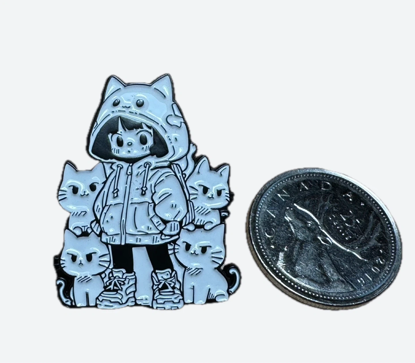 Cool enamel pin featuring a girl in a cat-ear hoodie surrounded by cats.