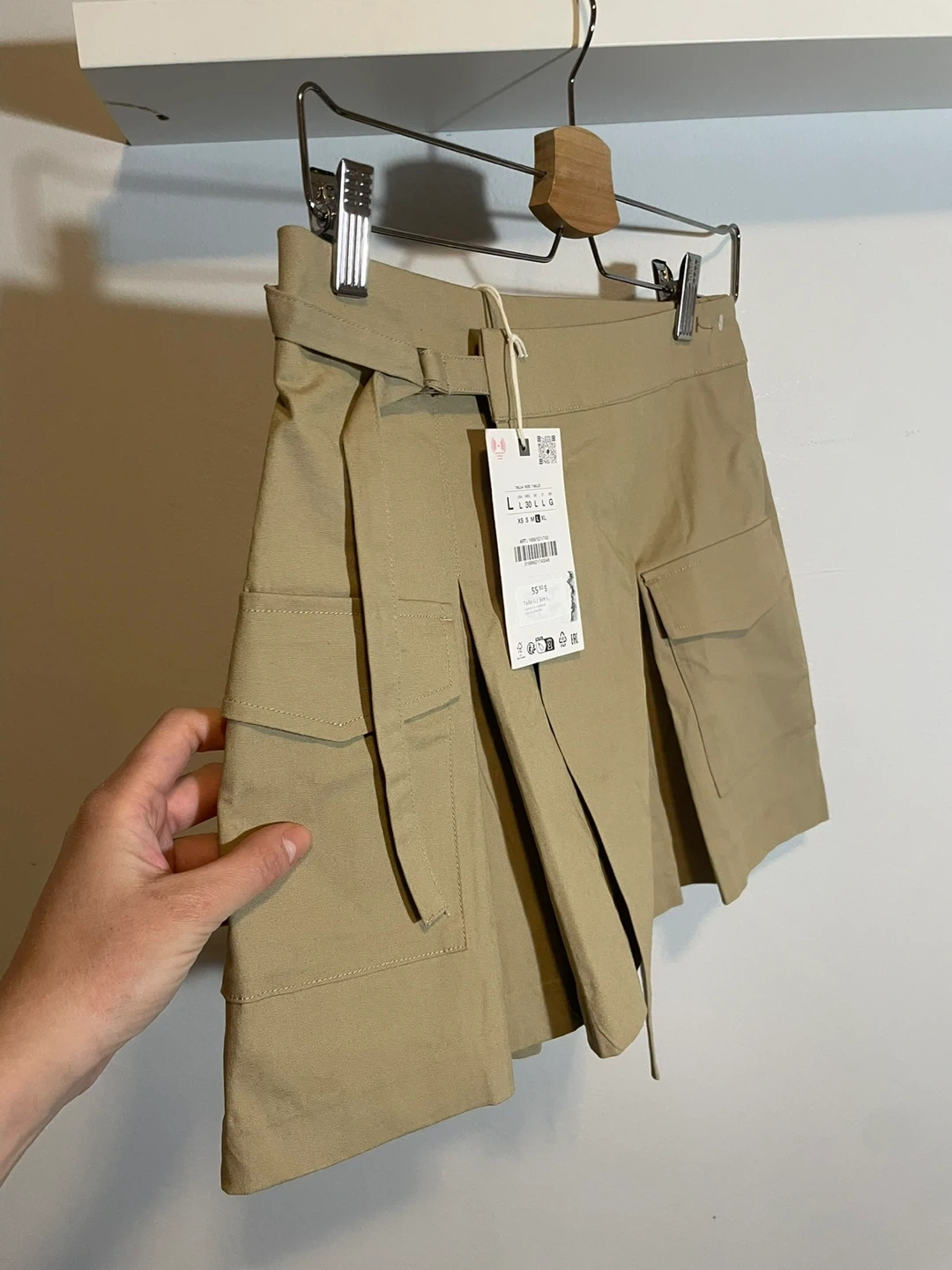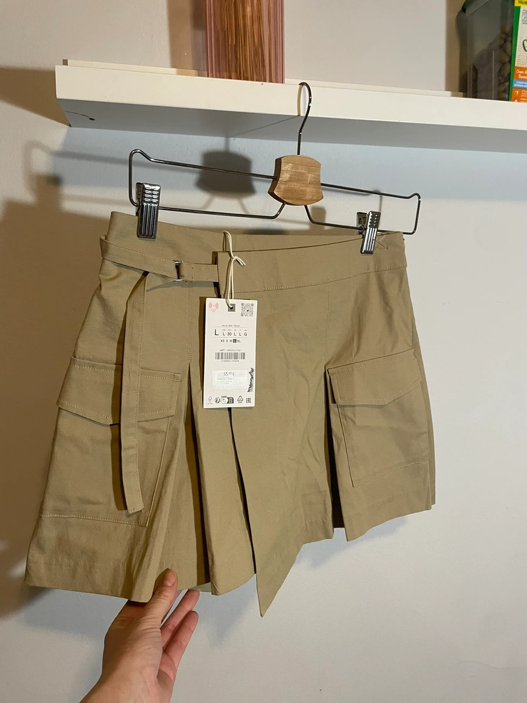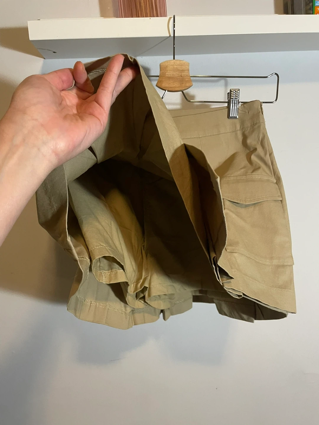 Tan cargo skort with a tie belt. Features multiple pockets and a pleated detail. Made from a cotton blend. It's great for everyday wear!