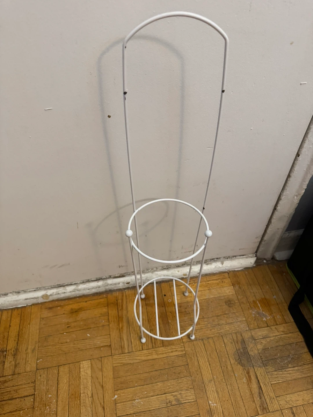 A slim white metal stand designed to hold toilet paper rolls. It features a rounded top and a circular base with supporting legs. Great for keeping extra rolls handy in the bathroom!