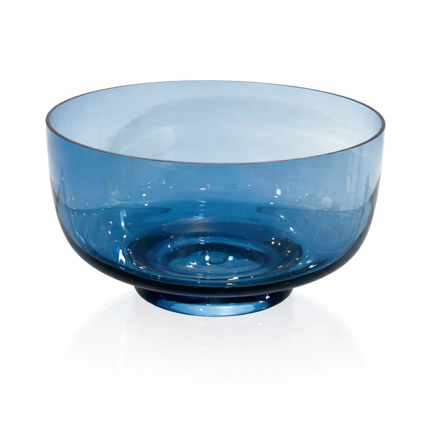 Offered is a substantial mid-20th-century blue art glass bowl, produced in thick pressed glass and distinguished by its refined proportions, exceptional weight, and luminous color. The bowl presents a broad, open mouth with gently flared walls, rising from a stepped circular foot that provides both visual lift and structural balance.