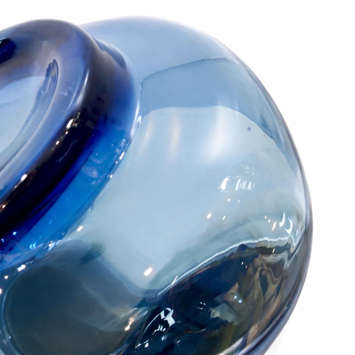 The glass displays a nuanced blue tonality, deepening toward the base and softening toward the rim. Close examination reveals controlled mold flow and clean pressing, confirming molded manufacture rather than free-blown production. The surface clarity is high, with uncontrolled air bubbles visible in macro views—an inherent feature of decorative glassmaking rather than a defect—adding depth and evidence of material movement during forming.