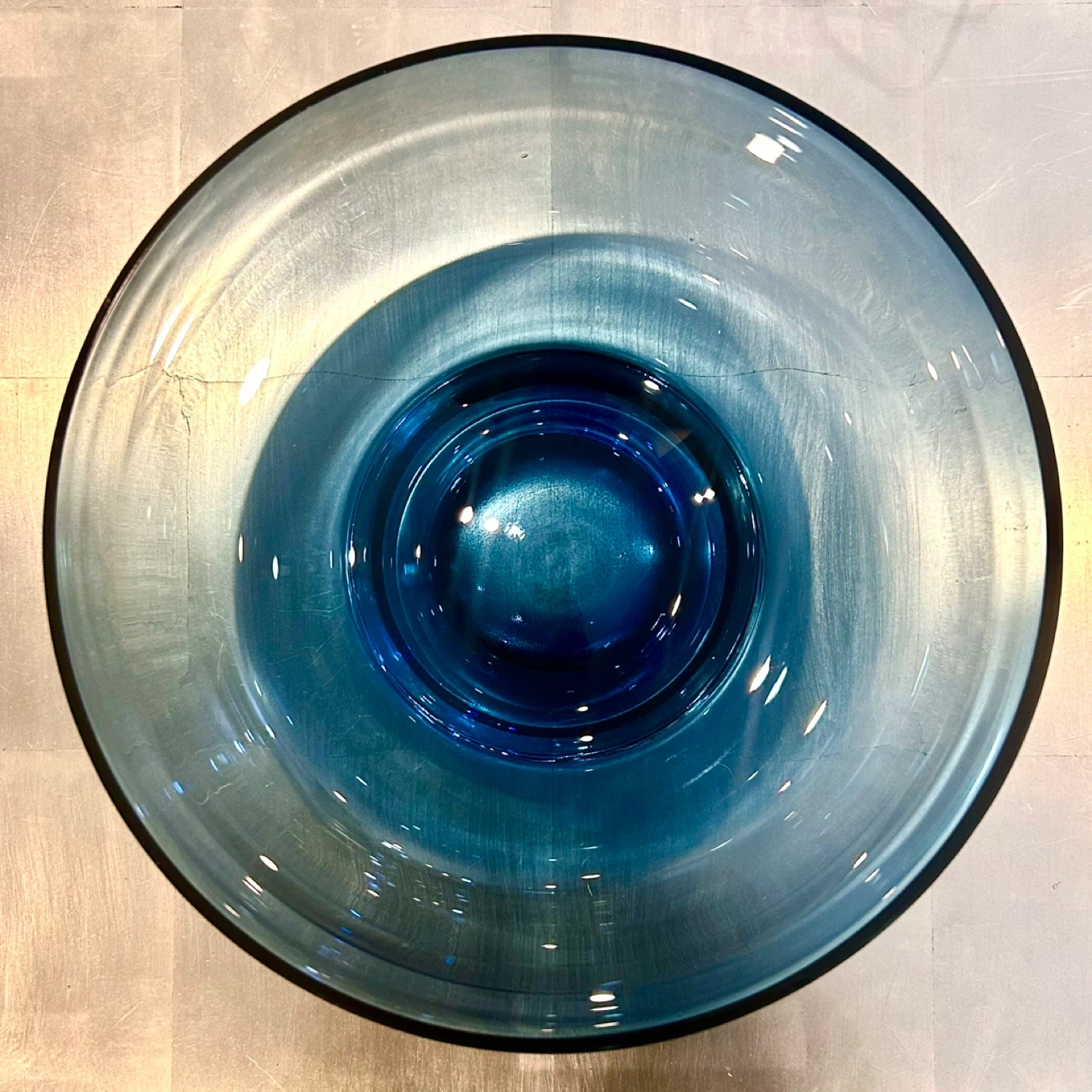mid century glass bowl, blue art glass, UV reactive glass, manganese glass, pressed glass bowl, sculptural glass, decorative art glass, collectible glass bowl, 1960s glass, heavy glass bowl, modernist decorative glass, exhibition glass, statement glass object, refined pressed glass, organic modern decor, blue glass centerpiece, museum style glass, mid century decorative object, glowing glass bowl, design glass