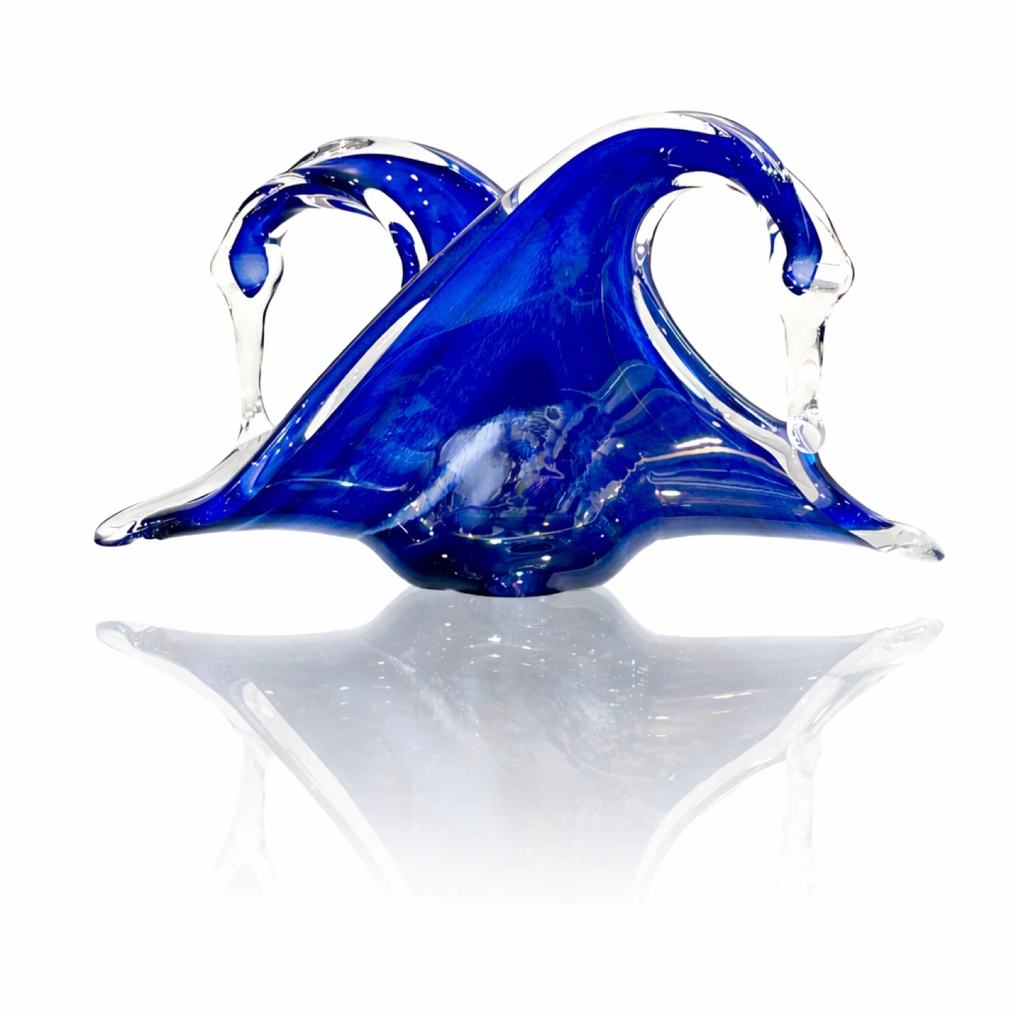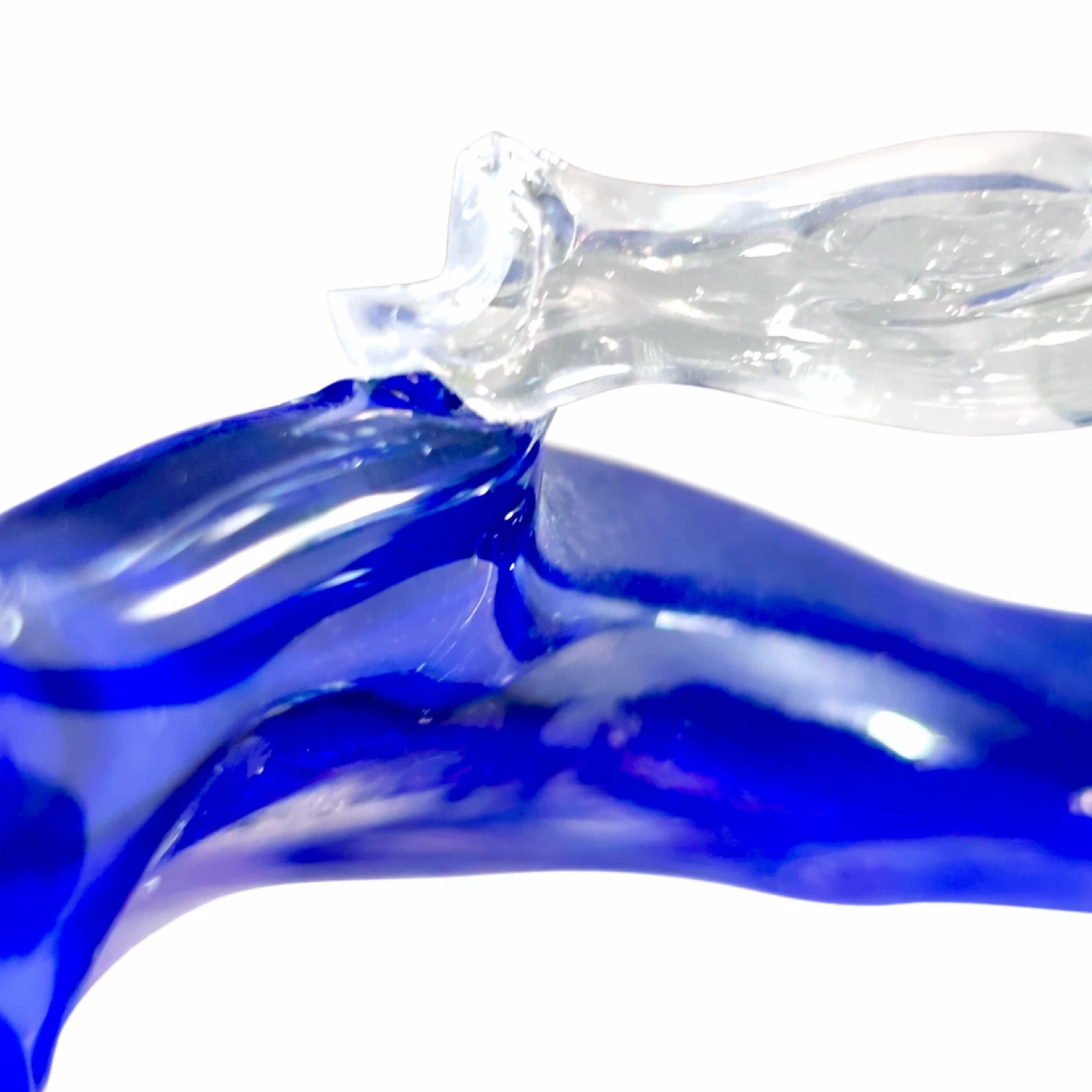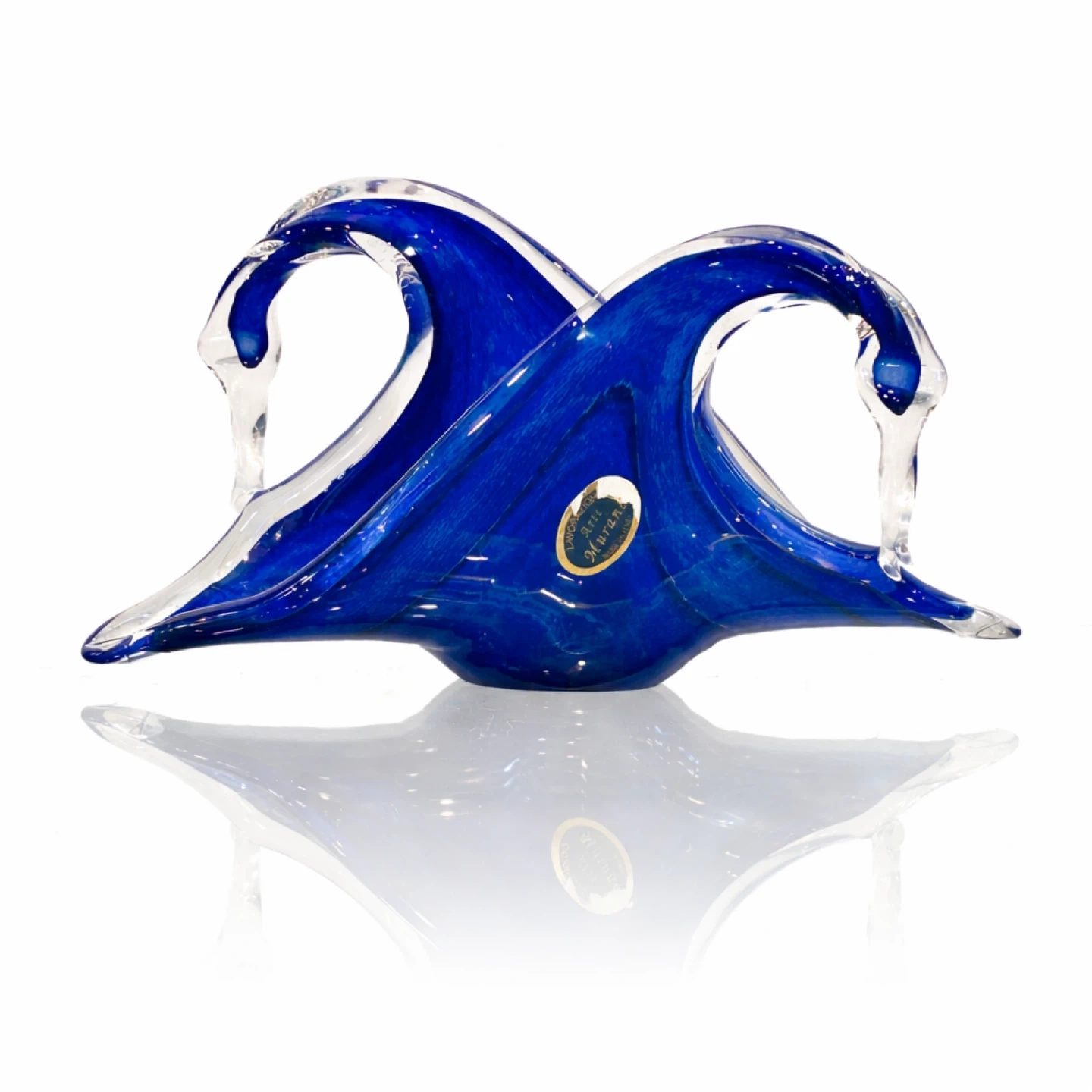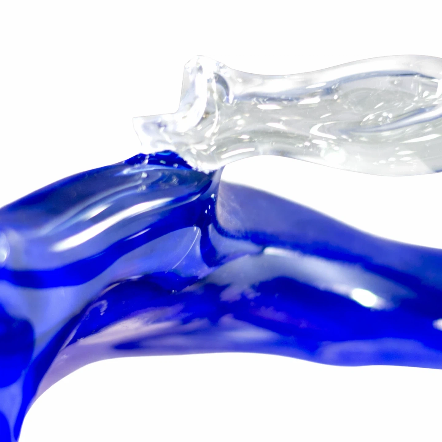 Sculptural decorative glass object produced on Murano, Italy, executed in richly saturated cobalt blue glass with clear crystal pulls, formed into a dynamic asymmetrical composition with opposing curled terminals. The piece emphasizes movement and tension, with thick glass masses drawn outward into translucent extensions, revealing controlled internal striation and tonal variation where blue transitions into clear glass.