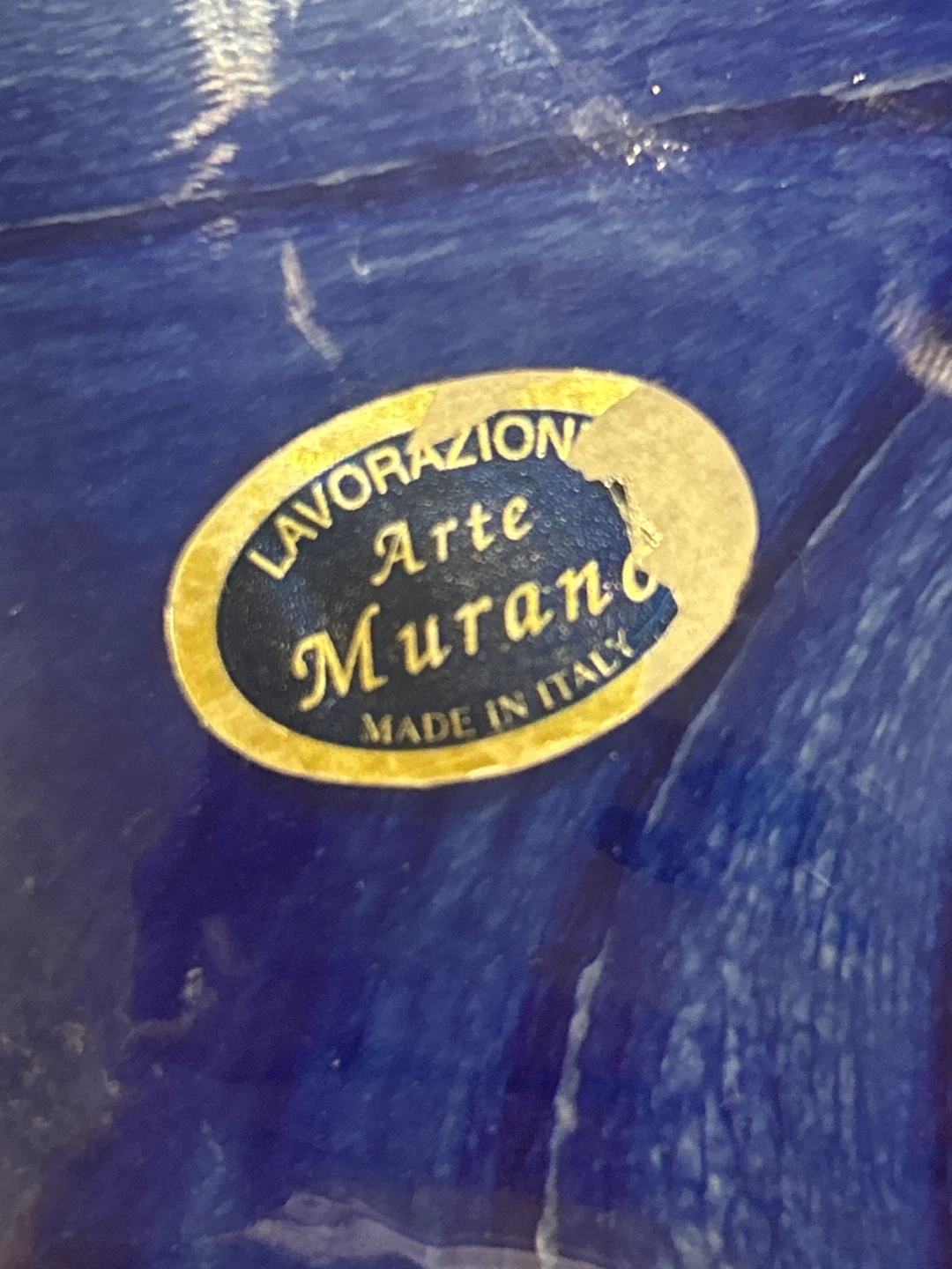 A period paper label reading “Lavorazione Arte Murano – Made in Italy” remains affixed. Labels of this type were commonly used for mid-century Murano export glass and indicate Murano production without attribution to a specific furnace or designer. The piece is therefore presented as unattributed Murano glass, in accordance with museum and academic cataloguing standards.