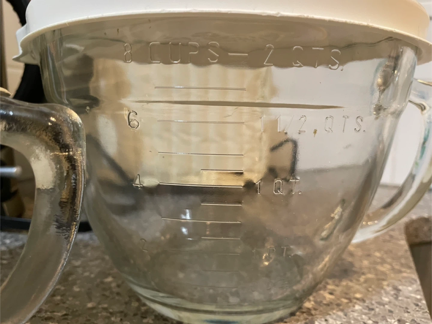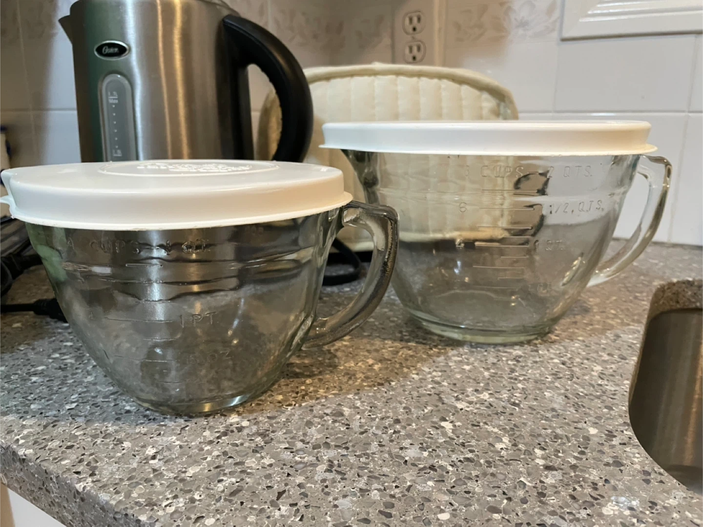 These are two glass mixing bowls from The Pampered Chef. They come with white lids. The larger bowl measures 8 cups/2 quarts and the smaller bowl measures 4 cups/1 quart. Great for mixing ingredients!