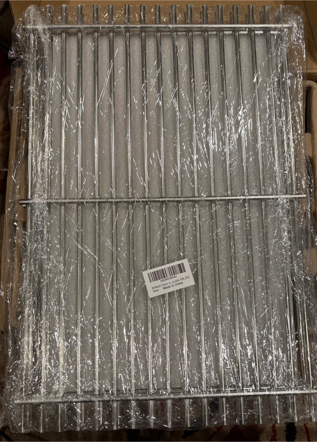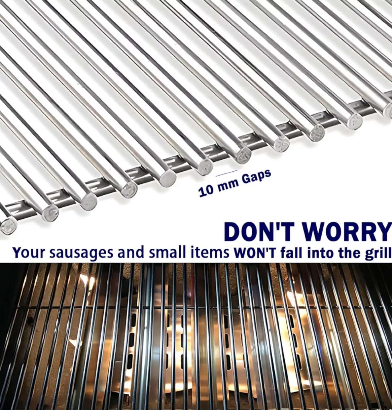 Set of two heavy-duty stainless steel grill grates. They measure 19.5" x 12.9" with 10mm gaps, ensuring small items won't fall through. Made of durable, food-grade 304 stainless steel with no sharp edges.