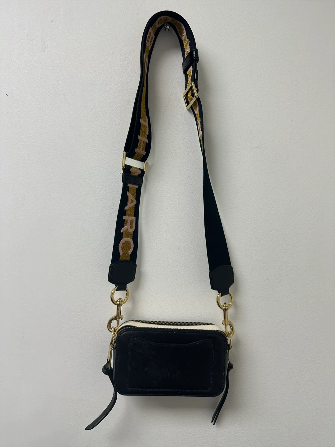 The Marc Jacobs Snapshot camera bag in black leather. It features a detachable logo strap and gold hardware. Perfect for carrying essentials on the go!