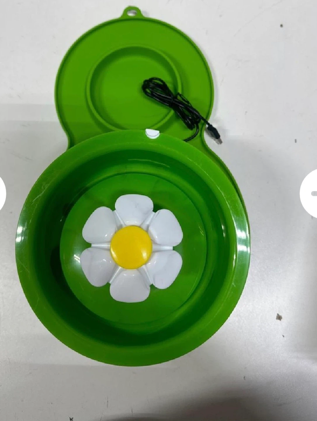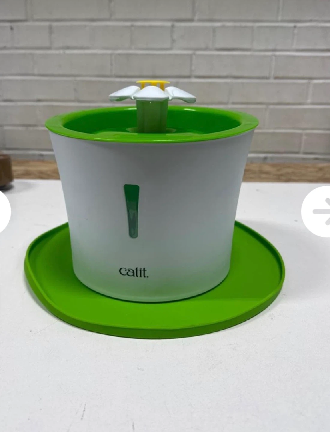 This Catit pet fountain is white and green with a flower-shaped top. It's designed to encourage pets to drink more water. The fountain has a water level indicator and comes with a USB power cord. It's made of durable plastic.