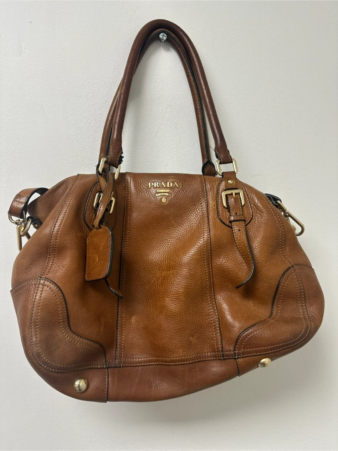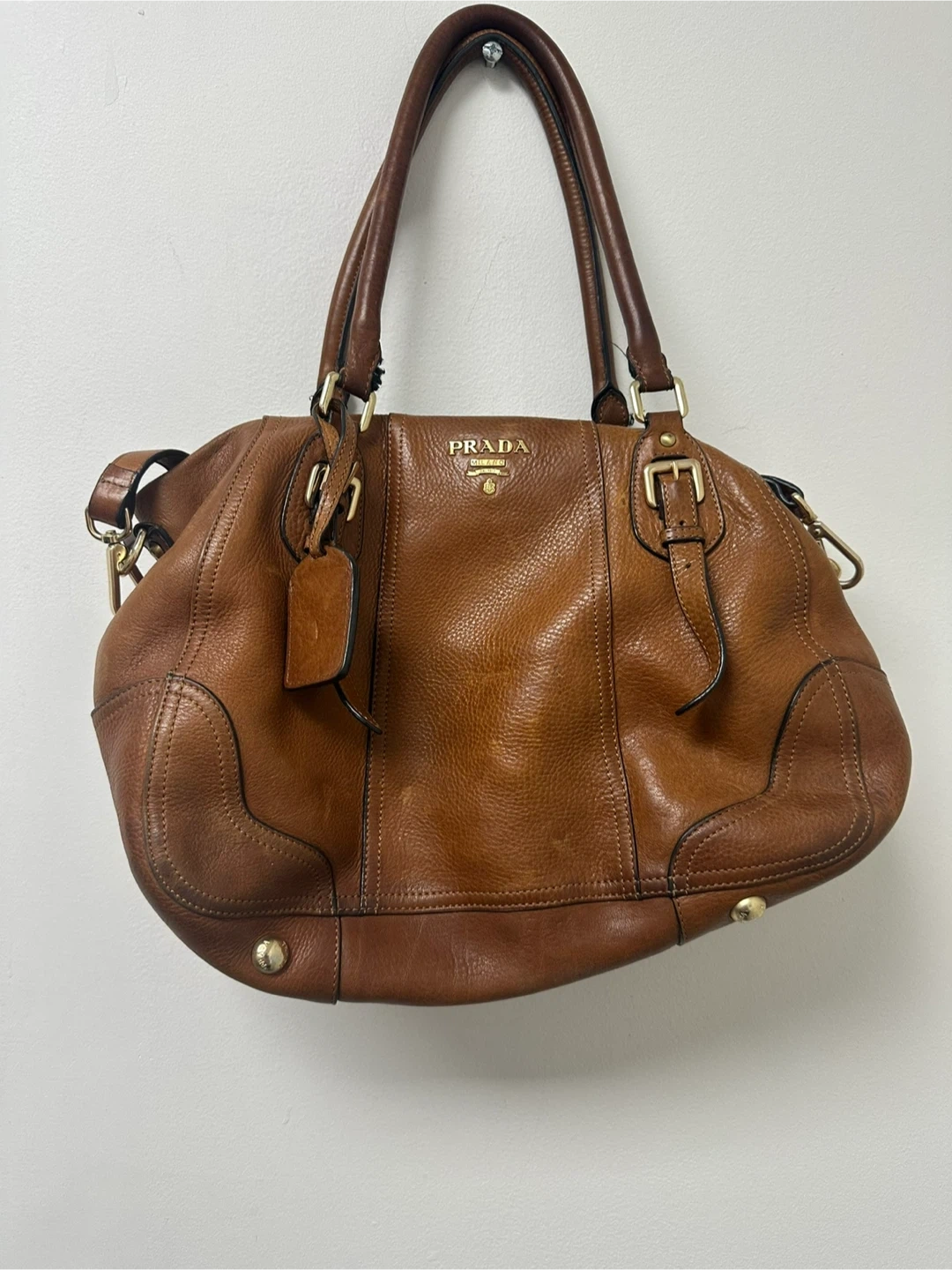 Classic PRADA satchel handbag. It's made from genuine brown leather with gold-tone hardware. Perfect for everyday use!