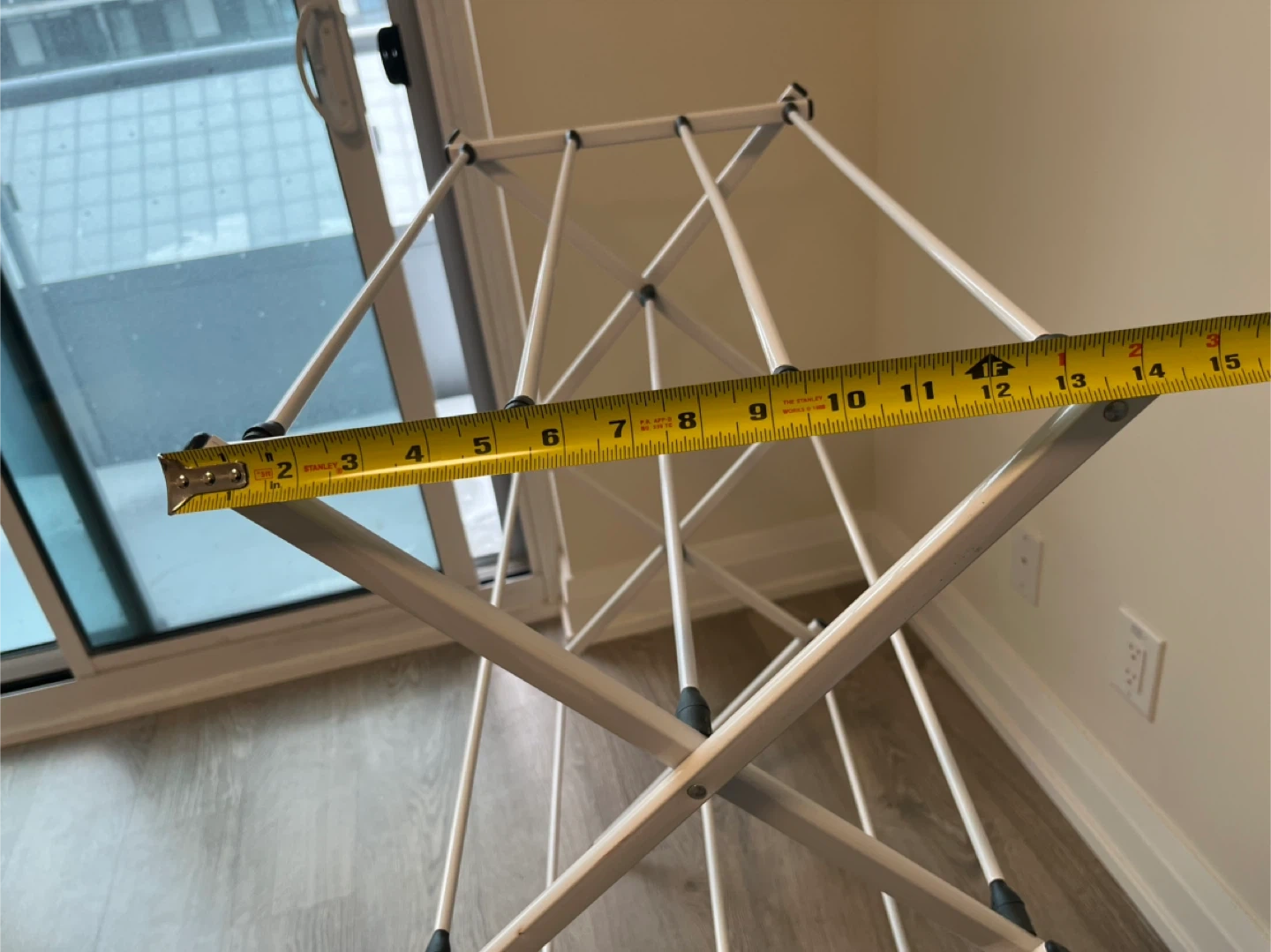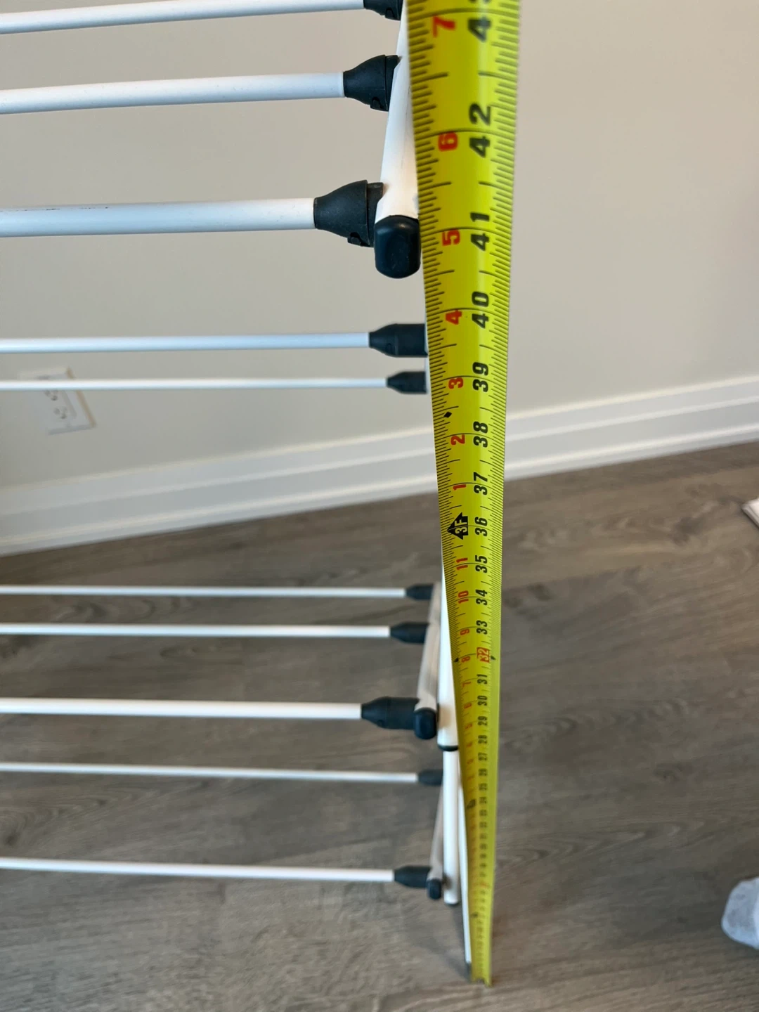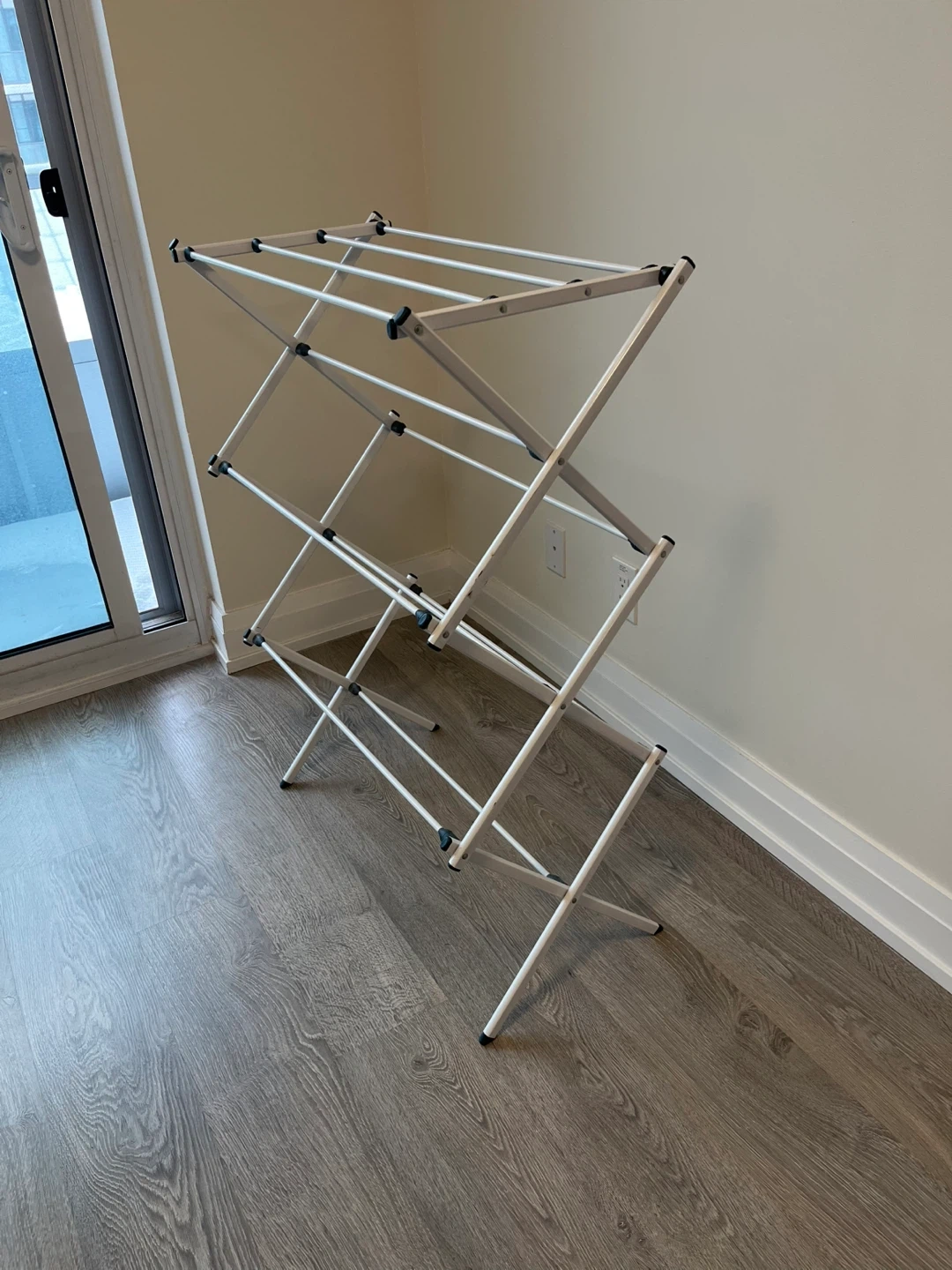 This white folding drying rack is made of metal. It's about 41 inches tall and 29 inches wide when open. It's a convenient way to dry clothes indoors.