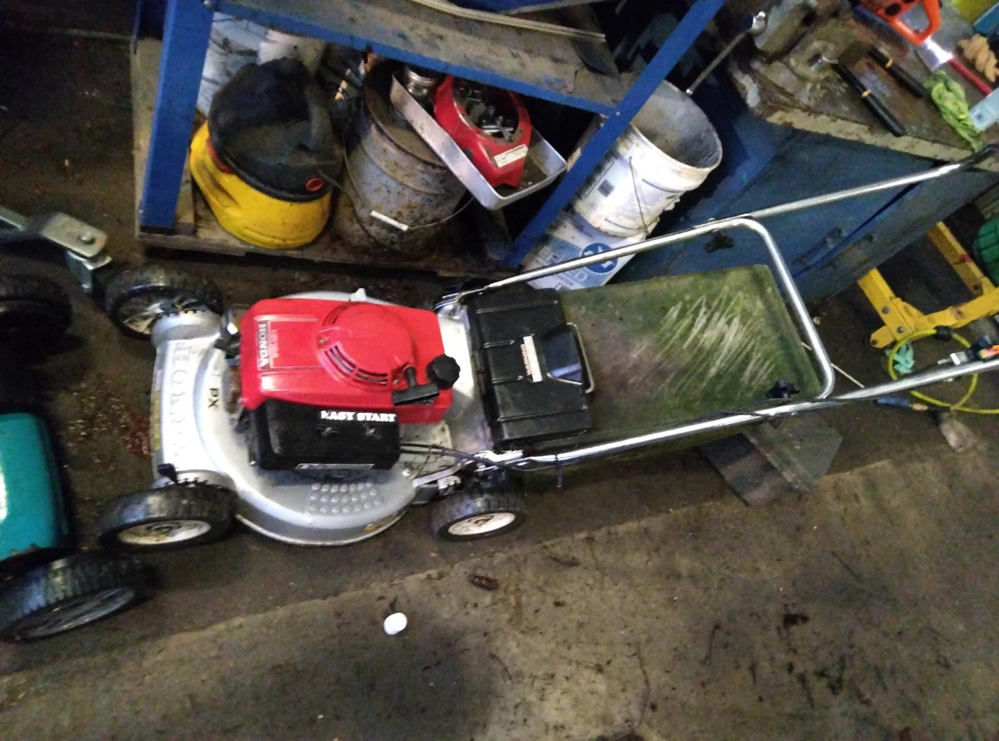 This is a Honda lawnmower with a red engine. It has a black 'Easy Start' label on the engine. The deck is silver with a grass catcher attached. Does not run