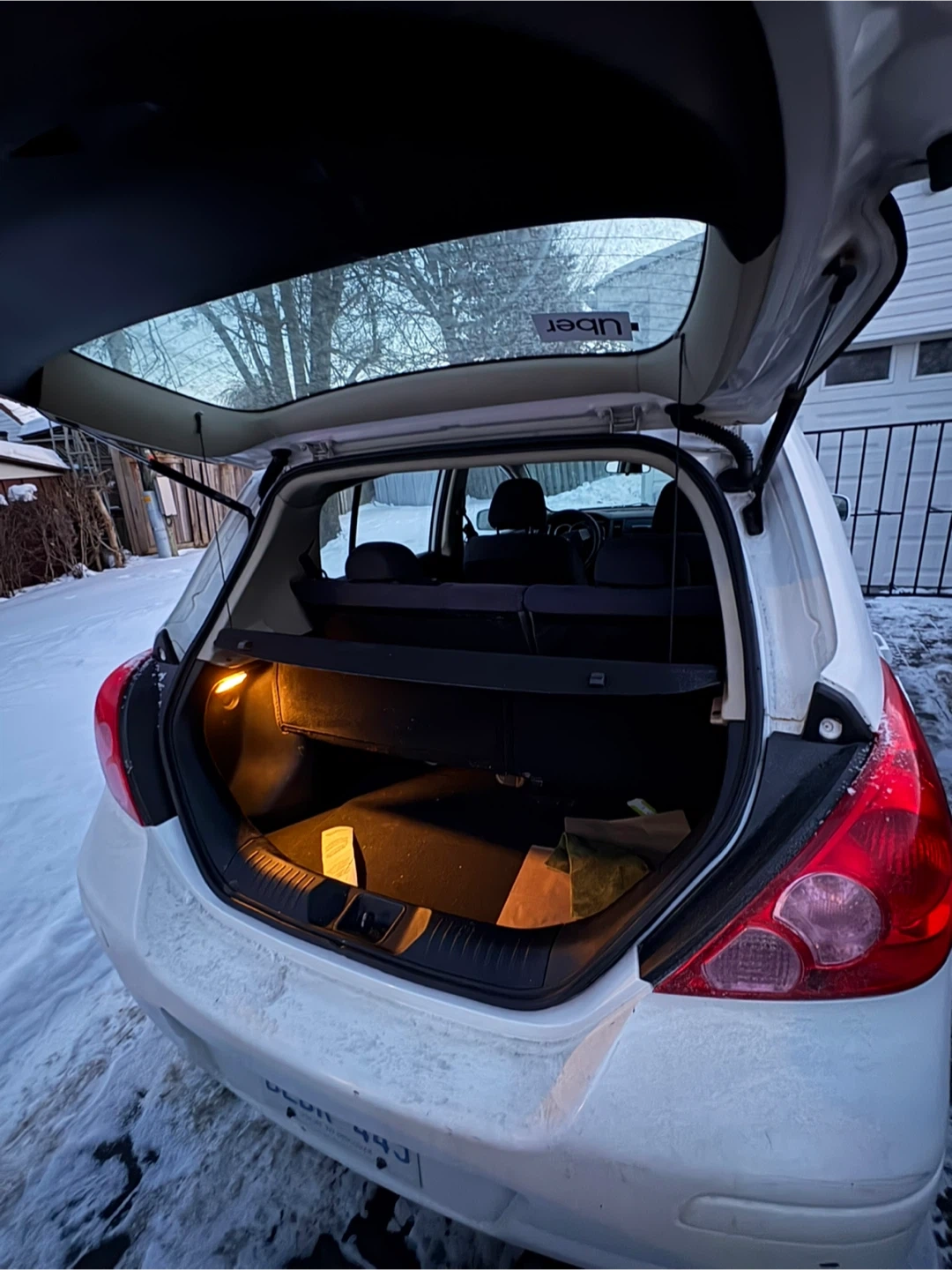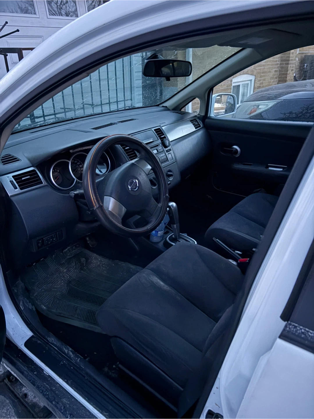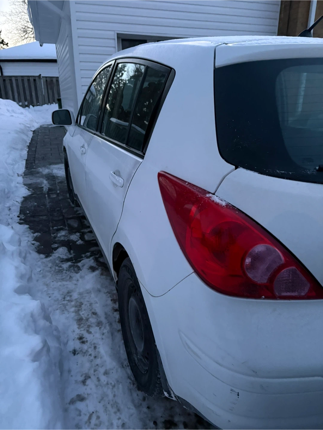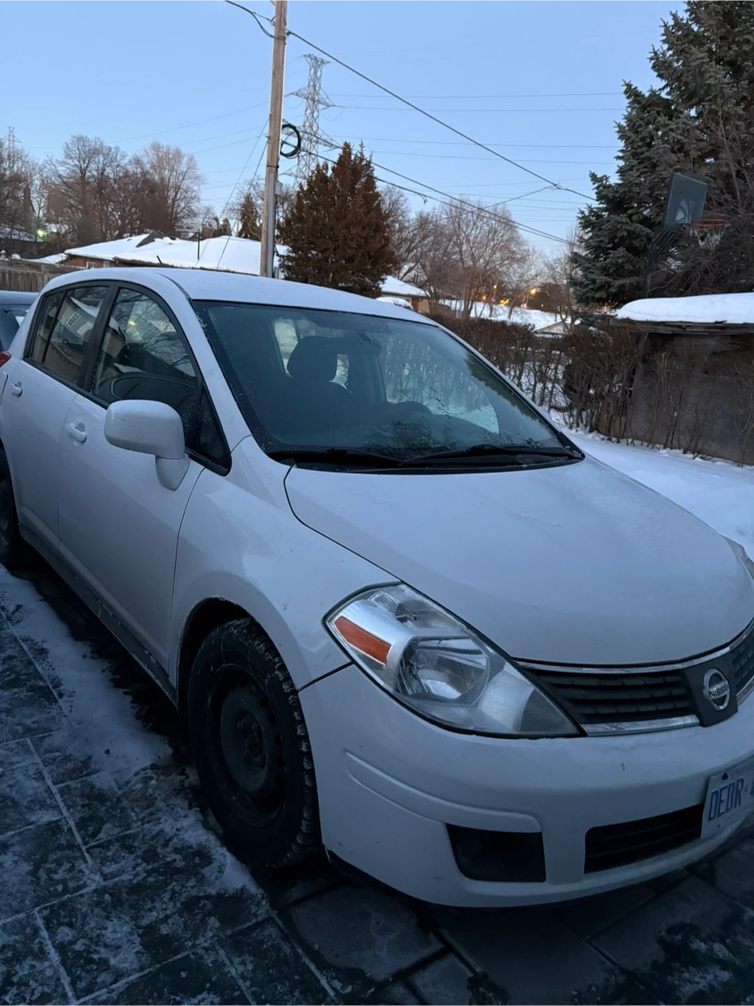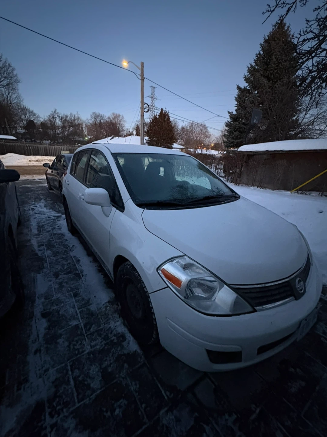 Selling a white Nissan Versa hatchback. It's a practical and fuel-efficient car. Plenty of space in the trunk for your cargo. Perfect for city driving or commuting!