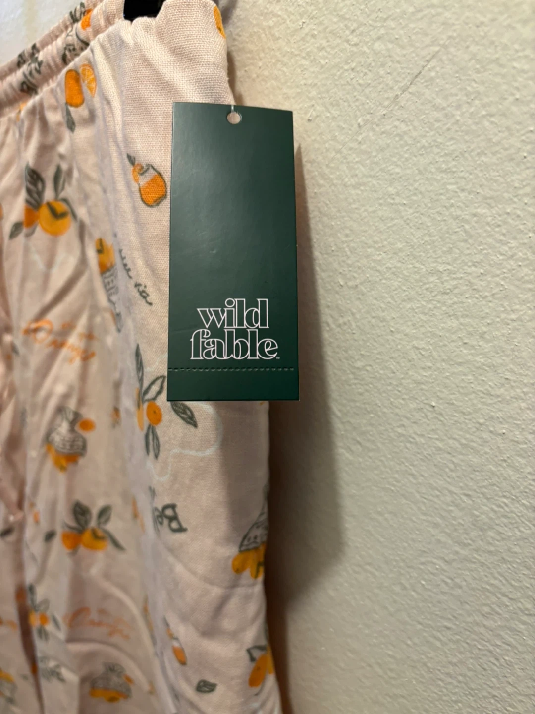 Wild Fable pajama pants with a peach and orange print. These comfy bottoms come in size L. The material is soft and breathable, perfect for lounging!