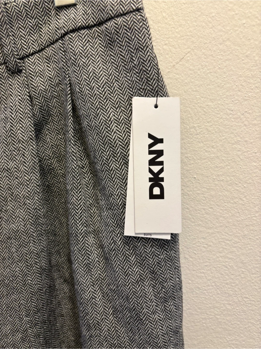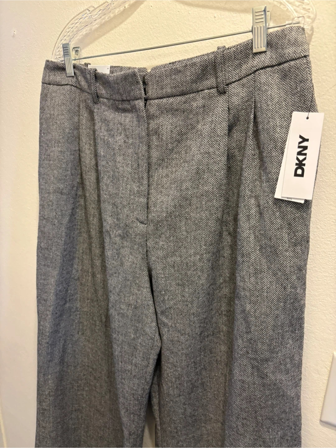 These DKNY pants feature a classic gray herringbone pattern. They're a size 14 with a wide-leg silhouette. Made with a blend of materials for comfort and durability.