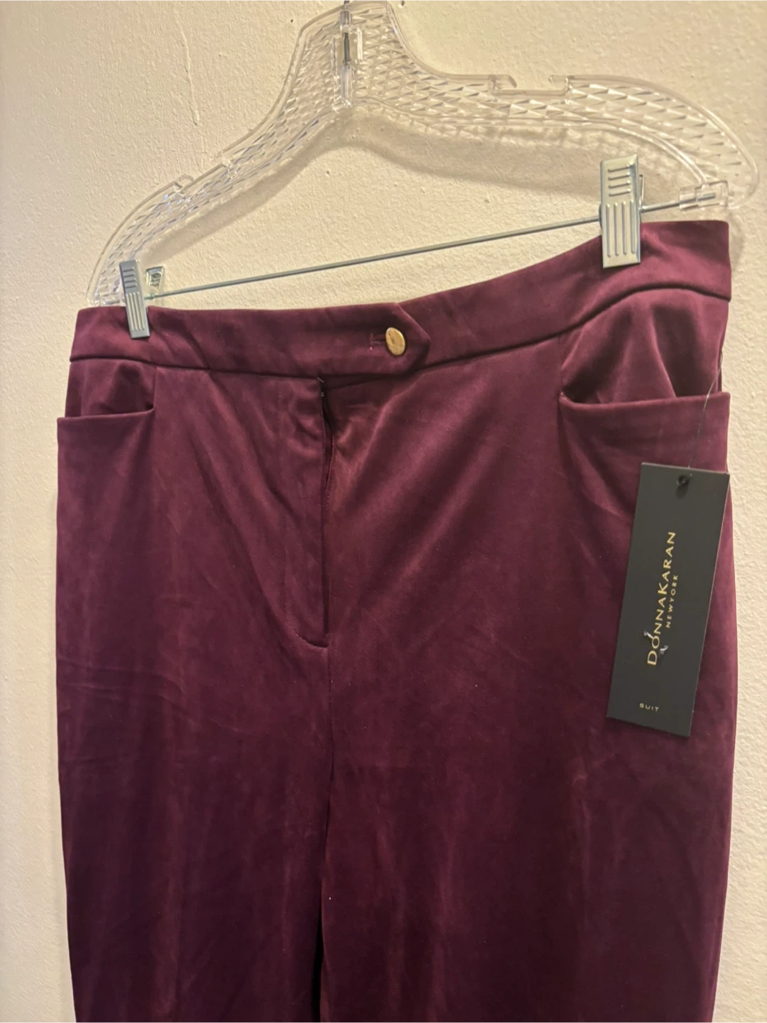 New with tags Donna Karan New York velvet pants in a deep burgundy color. These pants are a size 12. They're made from a soft velvet material.