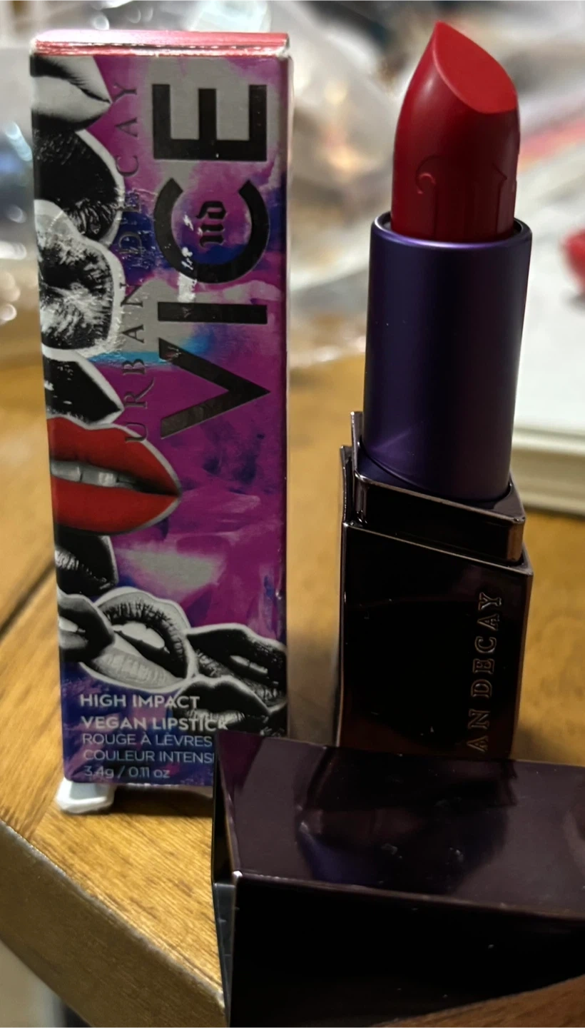 Urban Decay Vice lipstick in shade 714 Matte. This high impact vegan lipstick provides intense color. It's a vibrant red shade. Net weight 3g / 0.11 oz.