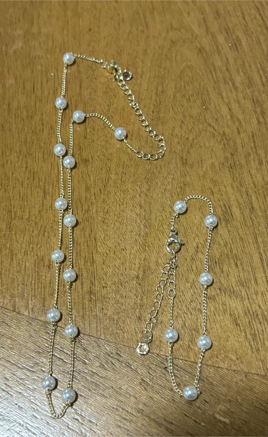 This delicate necklace features a gold-tone chain with evenly spaced faux pearls. It has an adjustable extender chain for a customized fit. Also include faux pearl bracelet. This piece adds a touch of classic elegance to any outfit!