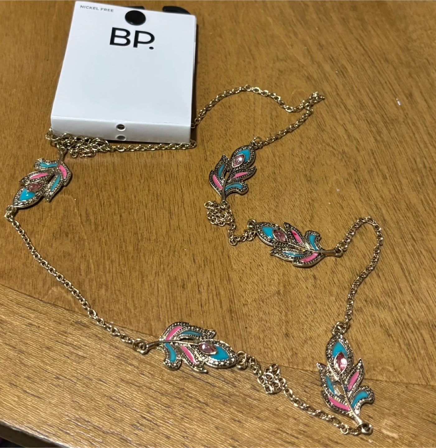 This BP. necklace features a delicate gold-tone chain. It's adorned with multiple feather-shaped charms in pink and turquoise enamel with small pink gem accents. Nickel-free construction.