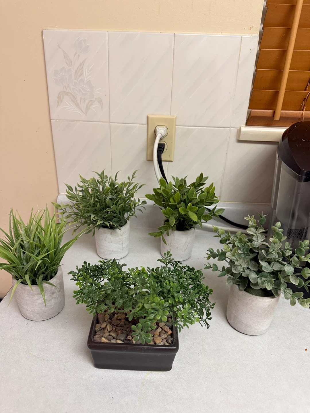 Five artificial plants, each in its own decorative pot. These require no watering or sunlight and are great for adding a touch of green to any space. They come in various styles and sizes.