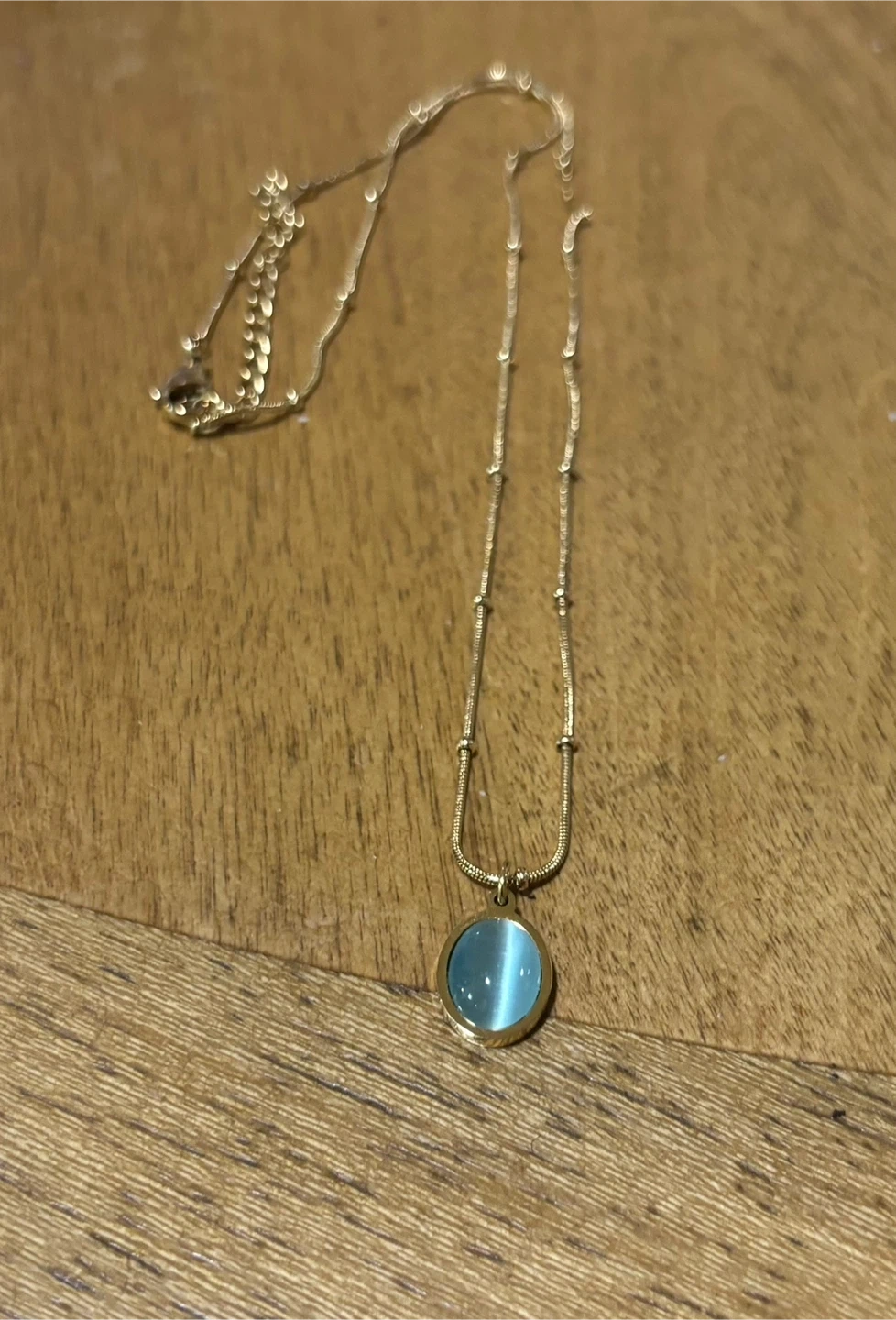 This delicate necklace features a gold-tone chain with a round blue cat's eye stone pendant. It's a beautiful accessory for everyday wear.