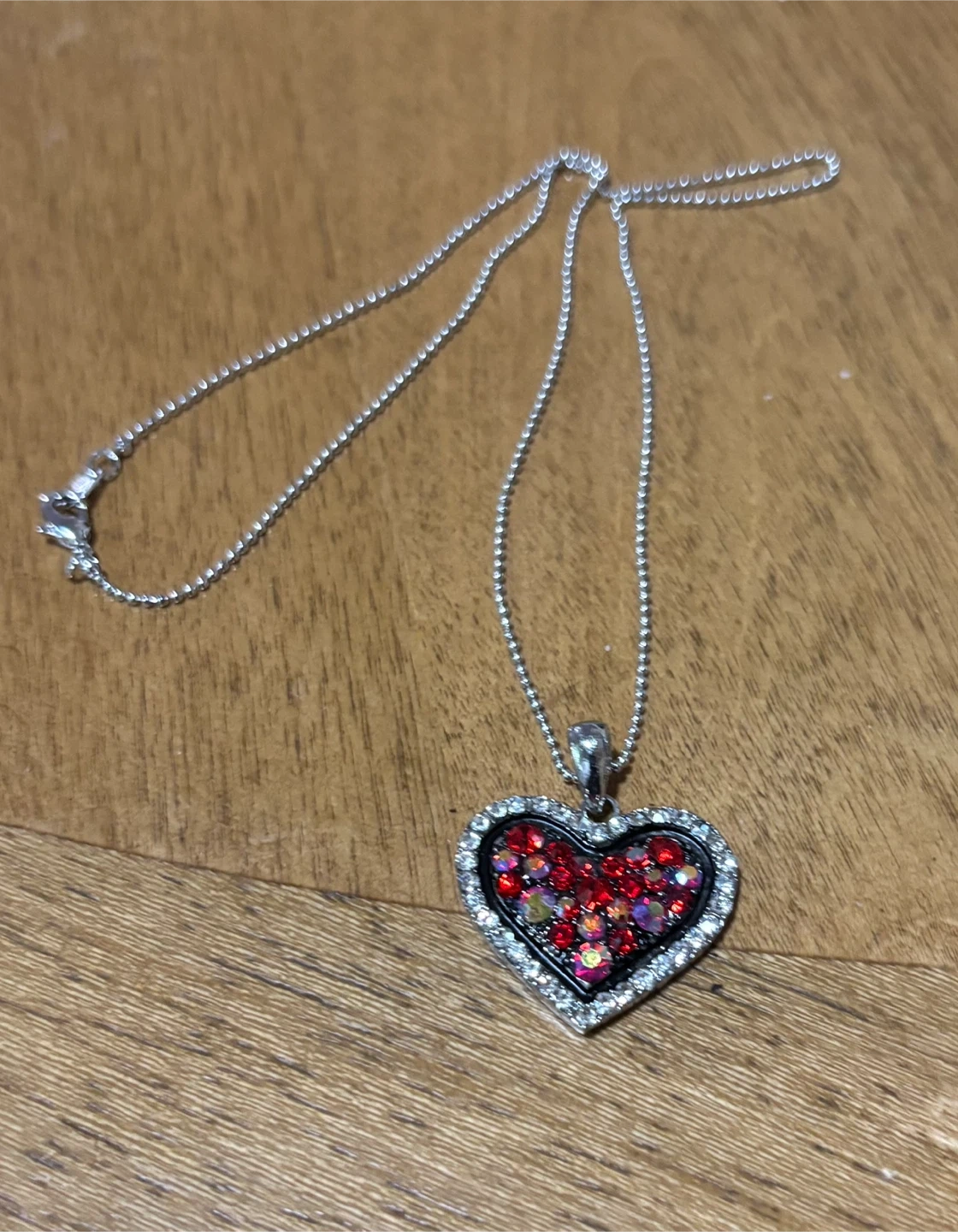 This necklace features a heart-shaped pendant encrusted with red and clear rhinestones. The chain is a silver-toned ball chain with a lobster clasp. It's a lovely accessory for adding a touch of sparkle!