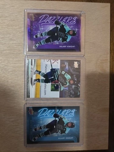 Own a piece of professional hockey history! This lot features three essential cards of Team USA legend and Boston Fleet Captain, Hilary Knight, from the landmark 2024-25 Upper Deck PWHL 1st Edition set. Because 2024-25 is the Inaugural Season of the PWHL, these are Hilary Knight’s official professional rookie cards. While she has had Olympic cards in the past, this is the first time in history she has a licensed card for a professional league—making every player in this set a "rookie" in the eyes of the hobby. This 3-Card Collection Includes: Dazzlers PURPLE (DZ-8): Rare Blaster-Exclusive parallel! Only found in retail boxes, making it a must-have for rainbow collectors. Dazzlers BLUE (DZ-8): The classic electric blue foil insert. Base Card (#9): The foundational card for the Boston Fleet’s first-ever season. All cards were pack-pulled and immediately sleeved. They are in Near Mint/Mint condition.